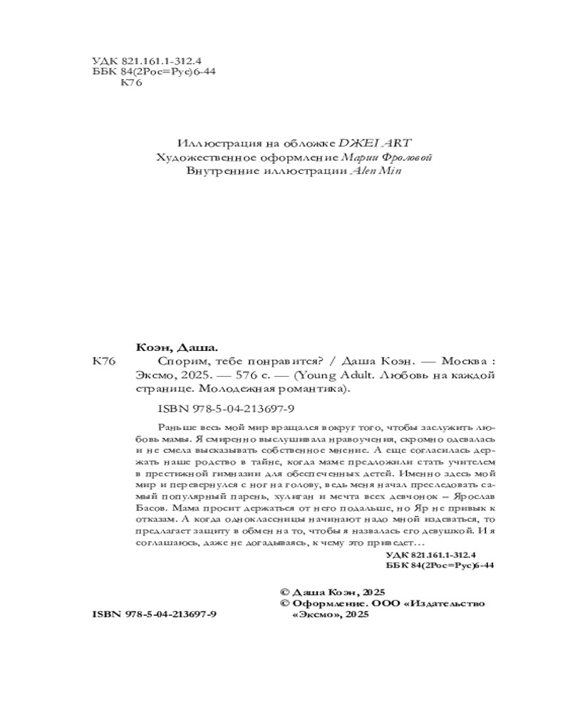 💳 Оплатить за товар можно при получении 🇰🇿 Есть бесплатная доставка по Казахстану от 1 дня 🎁 Копите бонусы с каждой покупки Серия: Young Adult. Любовь на каждой странице. Молодежная романтика Раньше весь мой мир вращался вокруг того, чтобы заслужить любовь мамы. Я смиренно выслушивала нравоучения, скромно одевалась и не смела высказывать собственное мнение. А еще согласилась держать наше родство в тайне, когда маме предложили стать учителем в престижной гимназии для обеспеченных детей. Именно здесь мой мир и перевернулся с ног на голову, ведь меня начал преследовать самый популярный парень, хулиган и мечта всех девчонок — Ярослав Басов. Мама просит держаться от него подальше, но Яр не привык к отказам. А когда одноклассницы начинают надо мной издеваться, то предлагает защиту в обмен на то, чтобы я назвалась его девушкой. И я соглашаюсь, даже не догадываясь, к чему это приведет... |