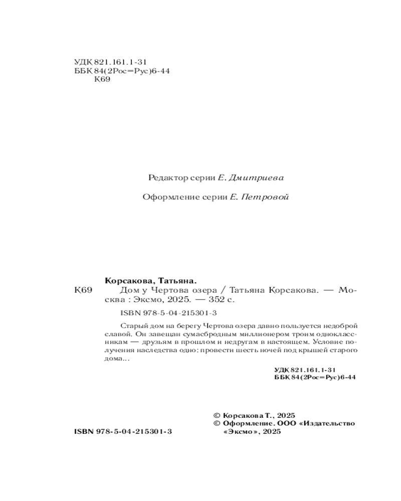 💳 Оплатить за товар можно при получении 🇰🇿 Есть бесплатная доставка по Казахстану от 1 дня 🎁 Копите бонусы с каждой покупки Серия: Татьяна Корсакова. Королева мистического романа. Новое оформление Старый дом на берегу Чертова озера давно пользуется недоброй славой. Он завещан сумасбродным миллионером троим одноклассникам — друзьям в прошлом и недругам в настоящем. Условие получения наследства одно: провести шесть ночей под крышей старого дома... |