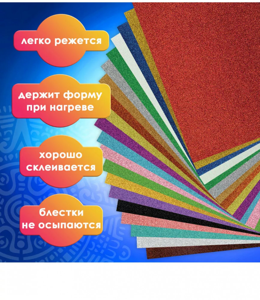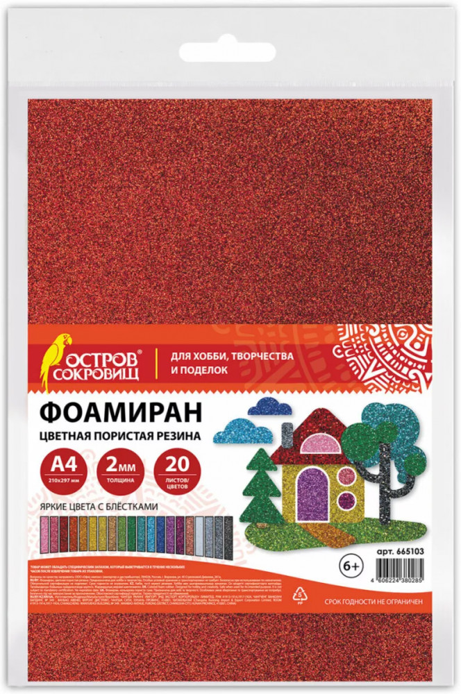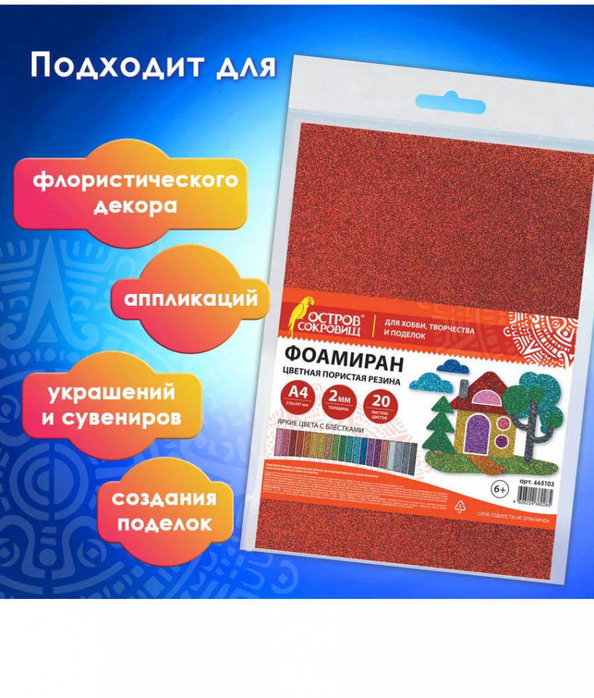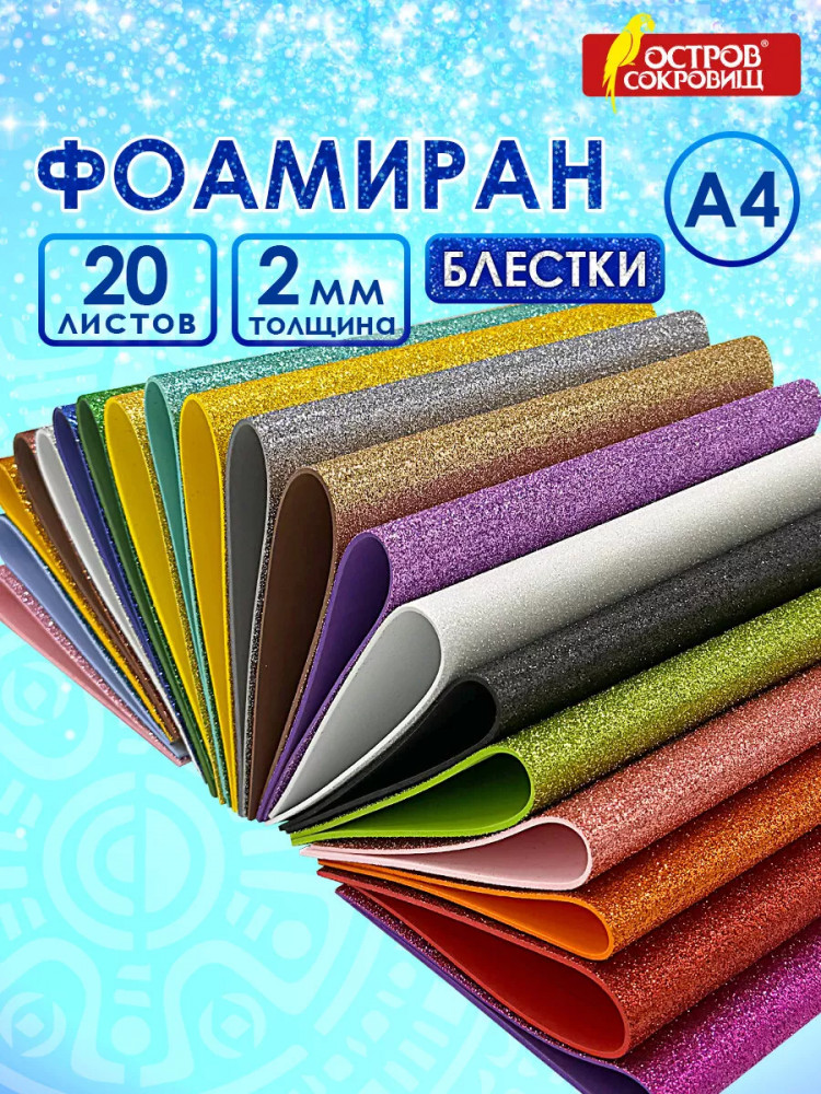 Цветная пористая резина с глиттером Остров сокровищ — блестящий материал для воплощения творческих идей! Остров сокровищ — это яркие товары для творчества, рукоделия и хобби для детей и взрослых! С пористой резиной Остров сокровищ поделки будут выразительными и запоминающимися. |
