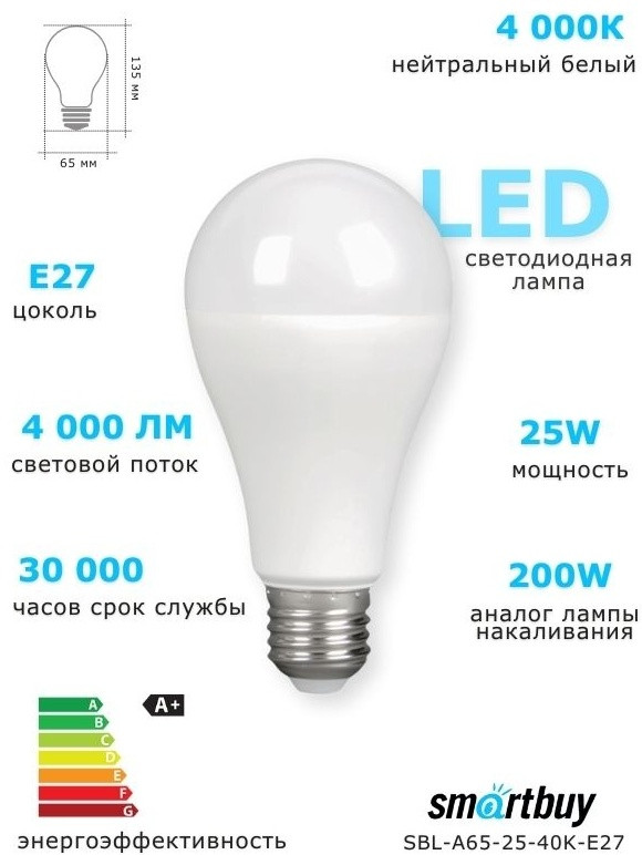 Светодиодная лампа (LED) SmartBuy подходит общего или декоративного освещения, подходит для замены стандартных ламп накаливания и галогенных. Благодаря своей экономичности, длительному сроку службы и экологичности светодиодные лампы выгодно отличаются от своих предшественников. Не содержит ртуть, экологически безопасна.
