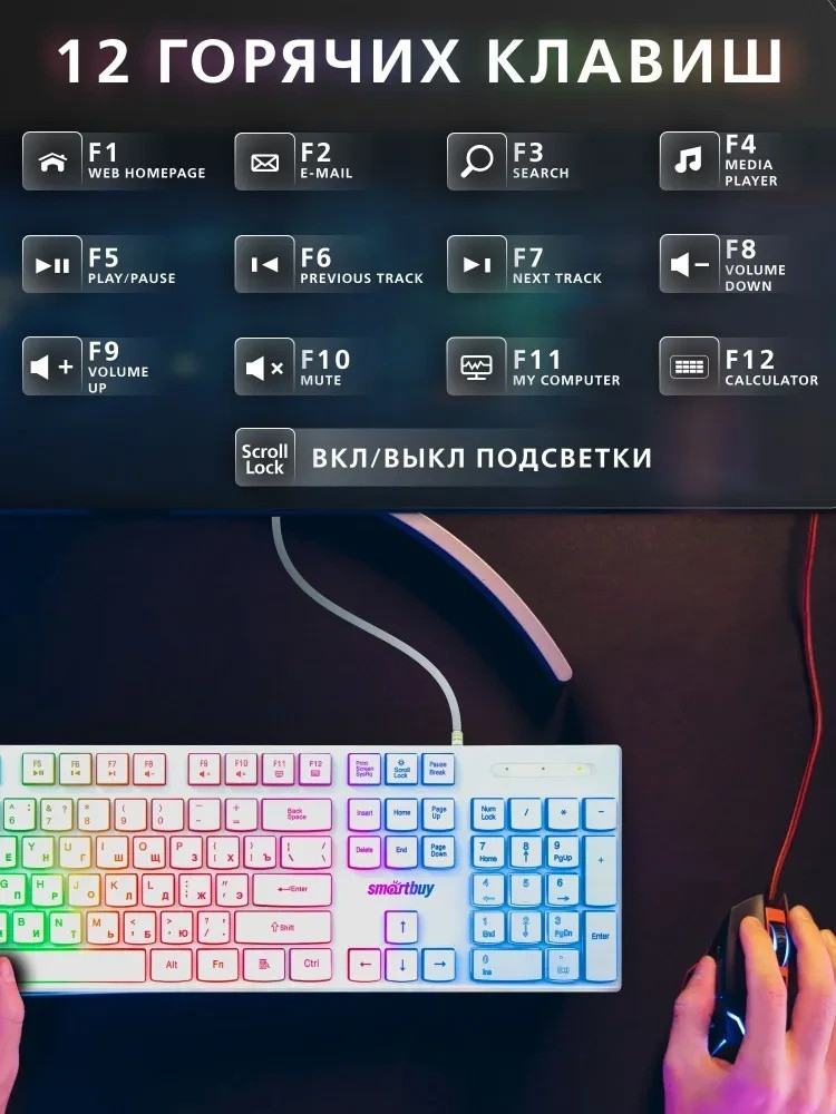Очень красивая клавиатура. Работает довольно тихо, по сравнению с моей прошлой. Подсветка работает, подключается от двух кнопок. Клавиатура заработала сразу после подсоединения к компьютеру, без сторонних приложений. Подсветка сочетается с мышкой от этого же бренда SBM-338-W