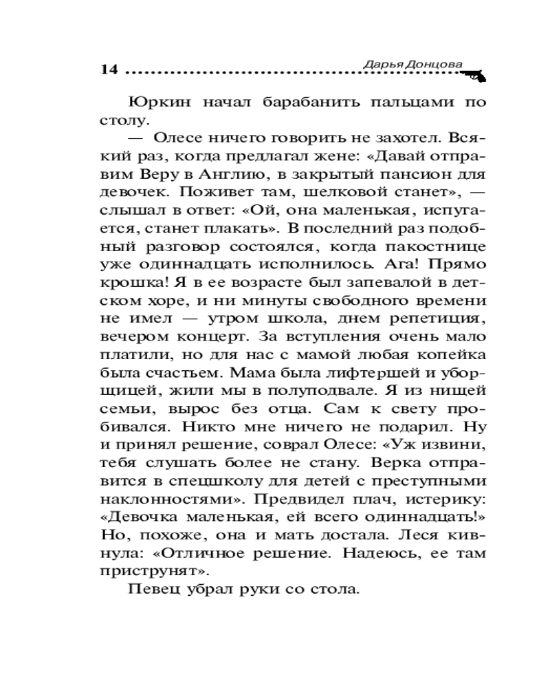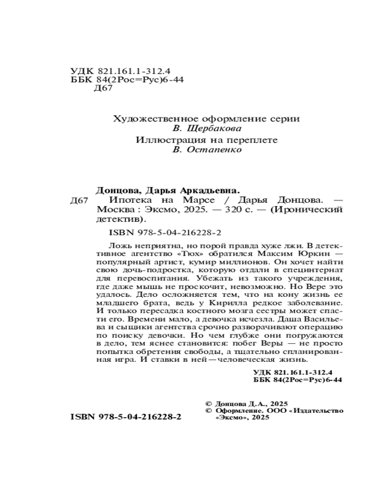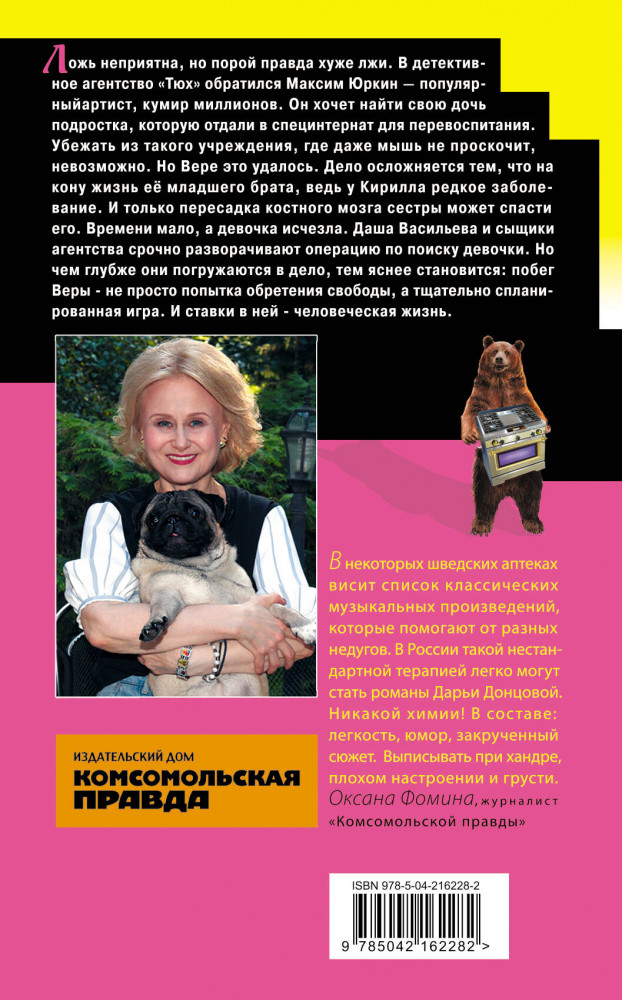 💳 Оплатить за товар можно при получении 🇰🇿 Есть бесплатная доставка по Казахстану 🎁 Копите бонусы с каждой покупки Серия: Иронический детектив Ложь неприятна, но порой правда хуже лжи. В детективное агентство «Тюх» обратился Максим Юркин — популярный артист, кумир миллионов. Он хочет найти свою дочь-подростка, которую отдали в специнтернат для перевоспитания. Убежать из такого учреждения, где даже мышь не проскочит, невозможно. Но Вере это удалось. Дело осложняется тем, что на кону жизнь ее младшего брата, ведь у Кирилла редкое заболевание. И только пересадка костного мозга сестры может спасти его. Времени мало, а девочка исчезла. Даша Васильева и сыщики агентства срочно разворачивают операцию по поиску девочки. Но чем глубже они погружаются в дело, тем яснее становится: побег Веры — не просто попытка обретения свободы, а тщательно спланированная игра. И ставки в ней — человеческая жизнь. |