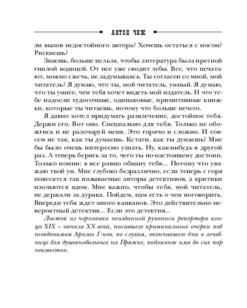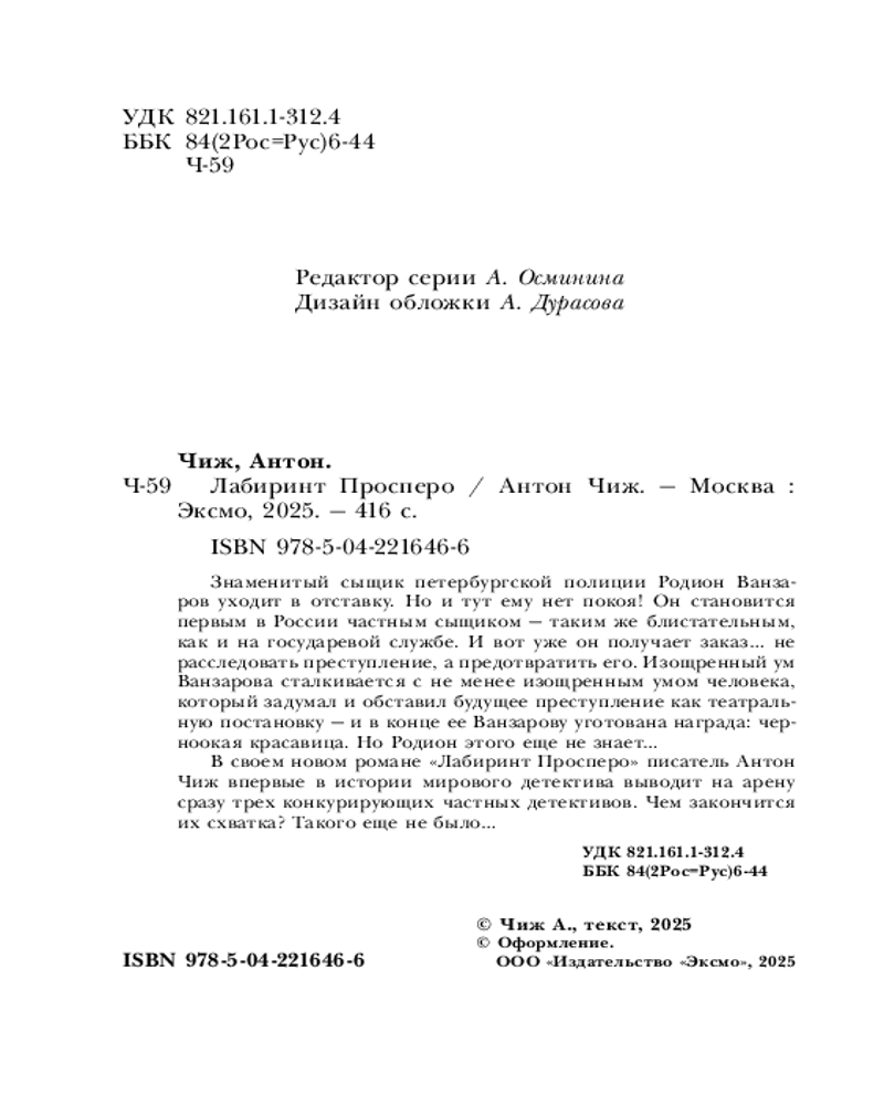💳 Оплатить за товар можно при получении 🇰🇿 Есть бесплатная доставка по Казахстану от 1 дня 🎁 Копите бонусы с каждой покупки Серия: Исторические детективы Антона Чижа (обложка) (цикл «Ванзаров») Знаменитый сыщик петербургской полиции Родион Ванзаров уходит в отставку. Но и тут ему нет покоя! Он становится первым в России частным сыщиком — таким же блистательным, как и на государевой службе. И вот уже он получает заказ... не расследовать преступление, а предотвратить его. Изощренный ум Ванзарова сталкивается с не менее изощренным умом человека, который задумал и обставил будущее преступление как театральную постановку, — и в конце ее Ванзарову уготована награда: черноокая красавица. Но Родион этого еще не знает... |