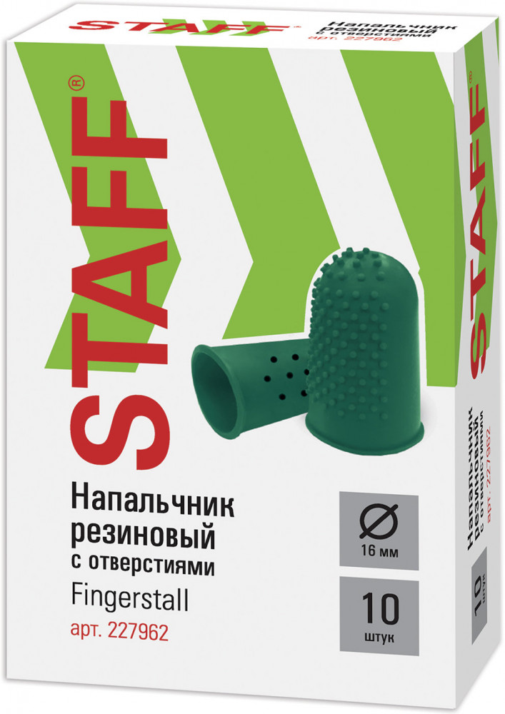 Серия: Everyday Напальчник Staff, изготовленный из высококачественной специальной мягкой резины, незаменим при работе с большим количеством бумаг. Рифленая поверхность обладает противоскользящим эффектом, а отверстия для вентиляции создают дополнительный комфорт. Размер, равный 28×16 мм, предусмотрен на среднюю руку. Минимальная толщина изделия (0,1 мм) позволяет чувствовать тонкие листы бумаг. Вес изделия — 3 г. 10 напальчников хватит надолго. Выполнены в зеленом цвете. Обилие распечатанных документов — это не только информация, но и опасность в виде порезов. Чтобы избежать неприятностей, приобретайте резиновые напальчники Staff. |