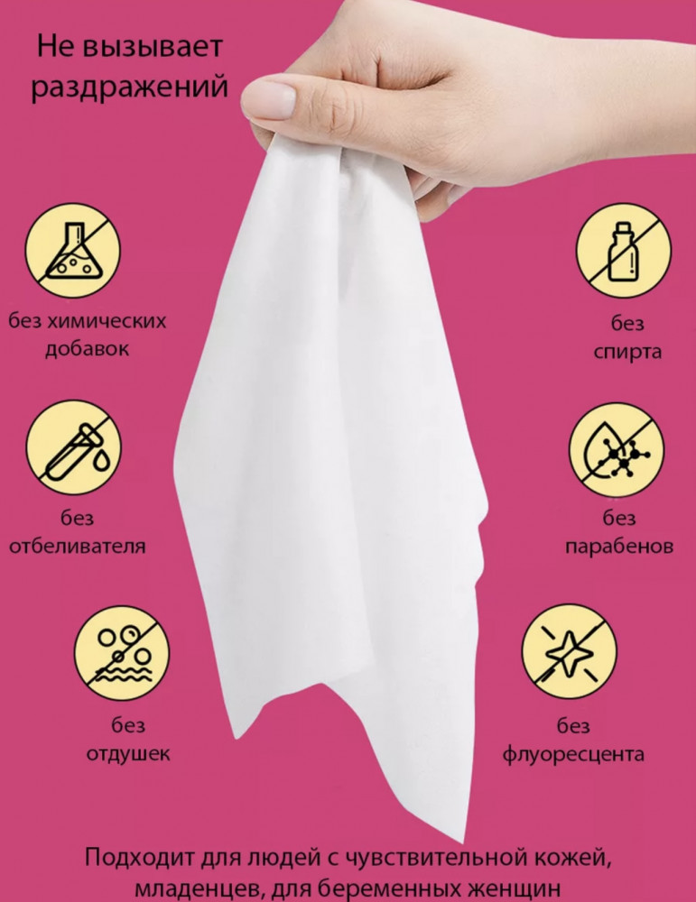 Подходят как для косметического применения: для лица, тела, так и для бытового применения: для кухни, фруктов, детских игрушек,сосок. Салфетки мягкие и приятные на ощупь, не вызывают раздражение даже у самой чувствительной кожи, но при этом прочные и имеют хорошую впитываемость. Надежная упаковка с уплотнительной наклейкой: салфетки не высыхают и сохраняют свои свойства длительное время.