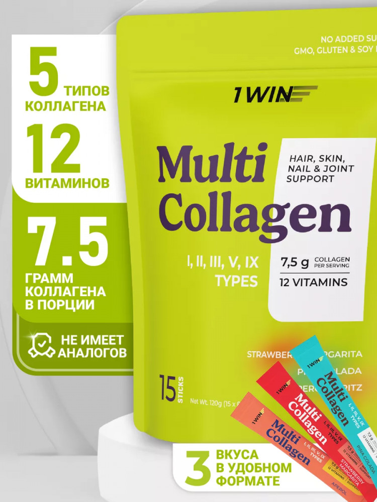 Экстренная компенсация дефицита коллагена в организме. Долгожданная новинка со вкусами любимых коктейлей. Мультиколлаген с витамином C от 1WIN со вкусами Апероля, Клубничной Маргариты и Пина-Колады. В упаковке находится коллаген в стиках — 15 штук с разными вкусами, которые удобно взять с собой. Один саше (одна порция) содержит высокую дозировку — 7,5 гр коллагена и комплекс из 12 витаминов. Состав не имеет аналогов на рынке. В БАД входит 5 типов коллагена (I, II, III, V, IX) и витаминный комплекс, включающий витамины E, A, D3, группы B. Гидролизованная форма и витамин С обеспечат более легкое усвоение коллагена и быструю «доставку» белка в кровь.