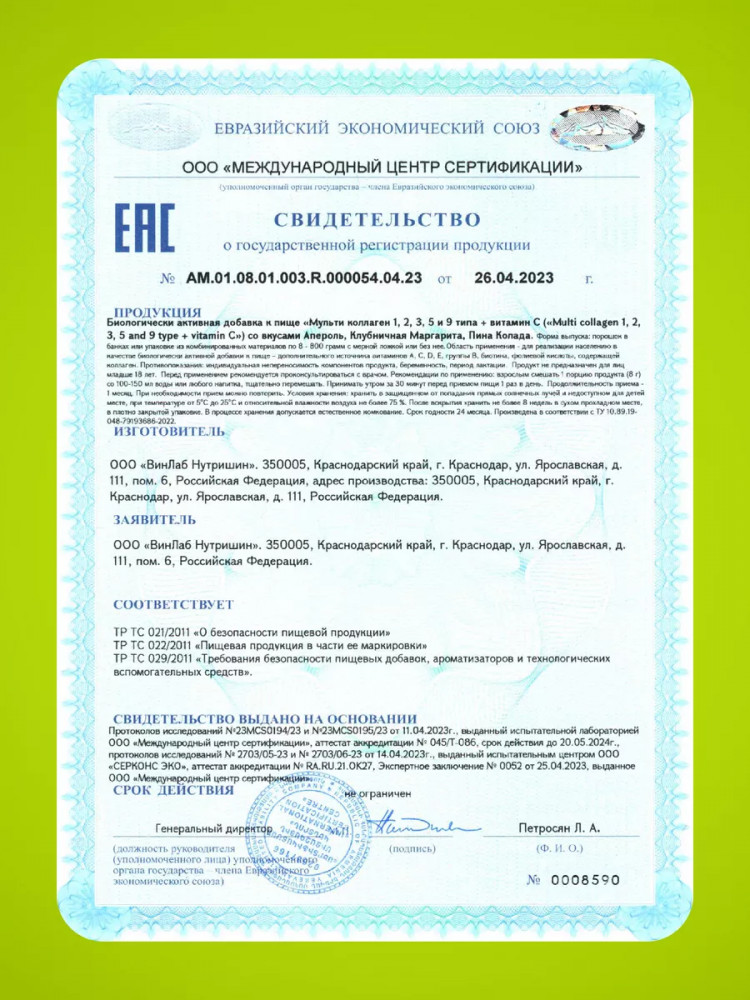 Способ применения и дозы: смешайте порцию Multi collagen с теплой водой или соком (100-150 мл). Принимайте утром за полчаса до еды. Продукт сертифицирован и имеет свидетельство о государственной регистрации.