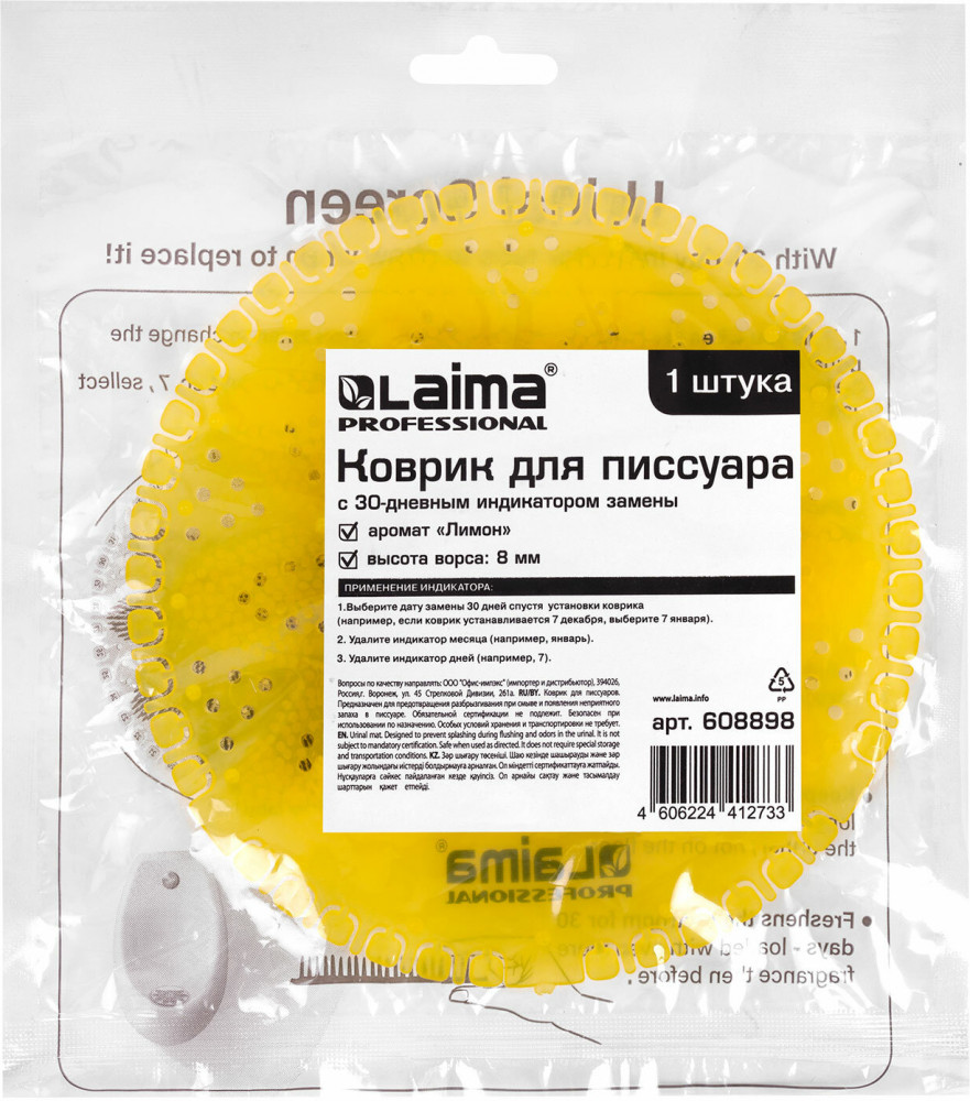 Дезодоратор коврик для писсуара Laima Professional — это защита от запаха и разбрызгивания до 30 дней и поддержание чистоты в туалетной комнате. Применяется в общественных туалетных комнатах отелей, офисных зданий, аэропортов, больниц, ресторанов. Коврик Laima Professional эффективно предотвращает неприятные запахи в общественных туалетных комнатах, обеспечивая приятный аромат в течение 30 дней. Благодаря особой структуре ворса эффективно предотвращает разбрызгивание воды и урины, что позволит сэкономить время и затраты на уборку. Он не только избавит от проблем, связанных с уборкой туалетной комнаты, но и устранит вероятность возникновение засоров.