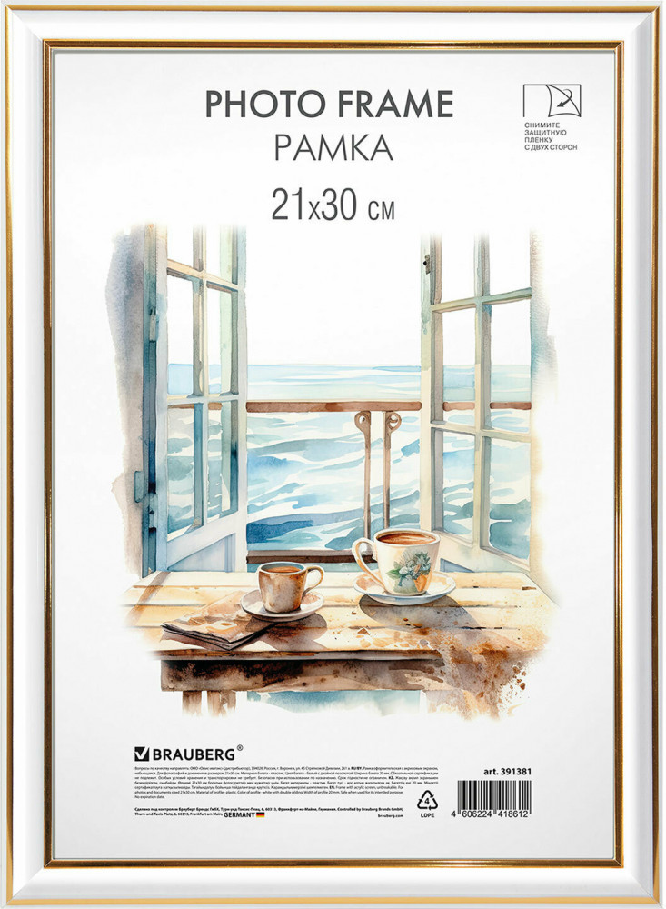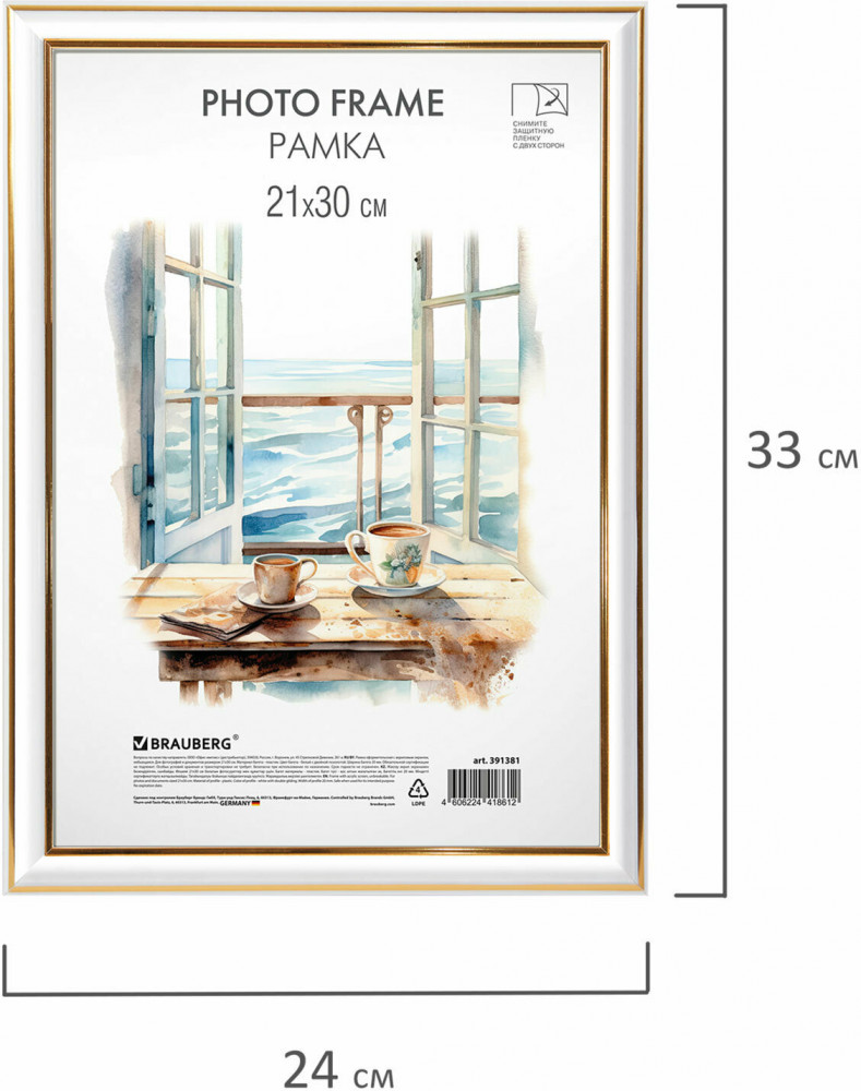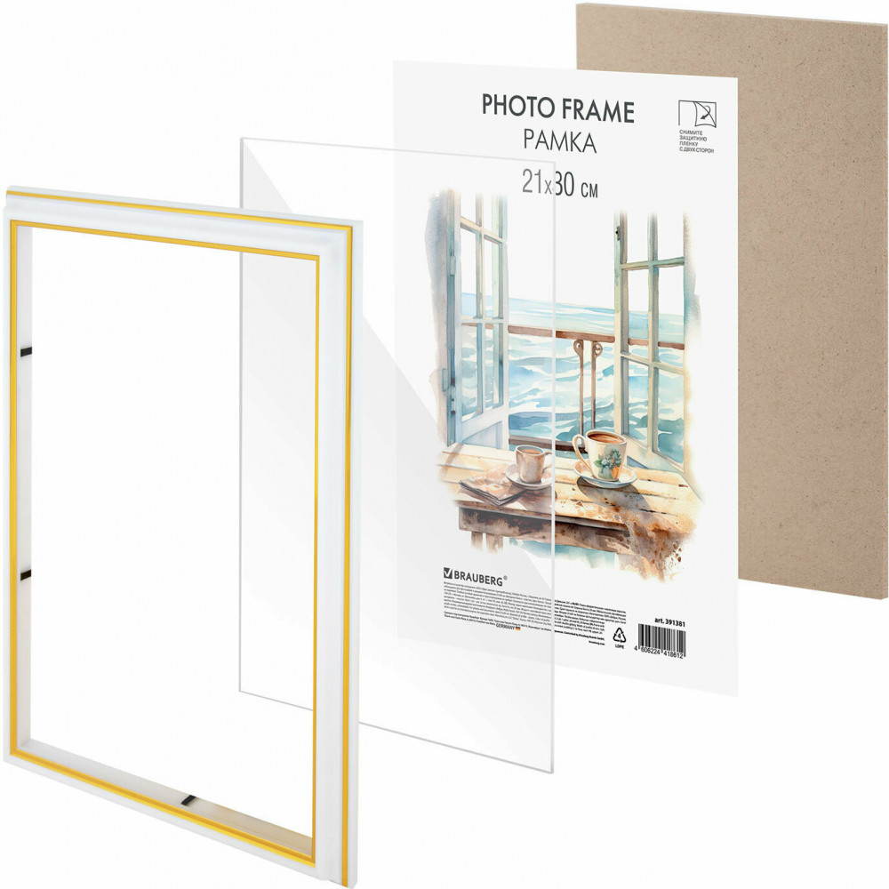 Рамка Brauberg «HIT3» для фотографий, дипломов, сертификатов и других ценных документов благодаря своему дизайну будет гармонично смотреться как в домашнем, так и в офисном интерьере, в магазинах, салонах и других учреждениях. Рамка стандартного формата А4 (21×30 см) выполнена из пластика в белом цвете с изюминкой в виде двойных золотистых линий, за счет чего отлично впишется как в домашний, так и в офисный интерьер. Имеется возможность вертикального и горизонтального подвеса. Ширина багета — 20 мм, высота — 14 мм. Вставка из акрила вместо обычного стекла делает рамку менее хрупкой. Перед применением снимите пленку с обеих сторон экрана. Задняя панель выполнена из прочного картона. Рамка поставляется в термоусадочной плёнке, которая гарантирует сохранность рамки при транспортировке, отсутствие сколов и потертостей.