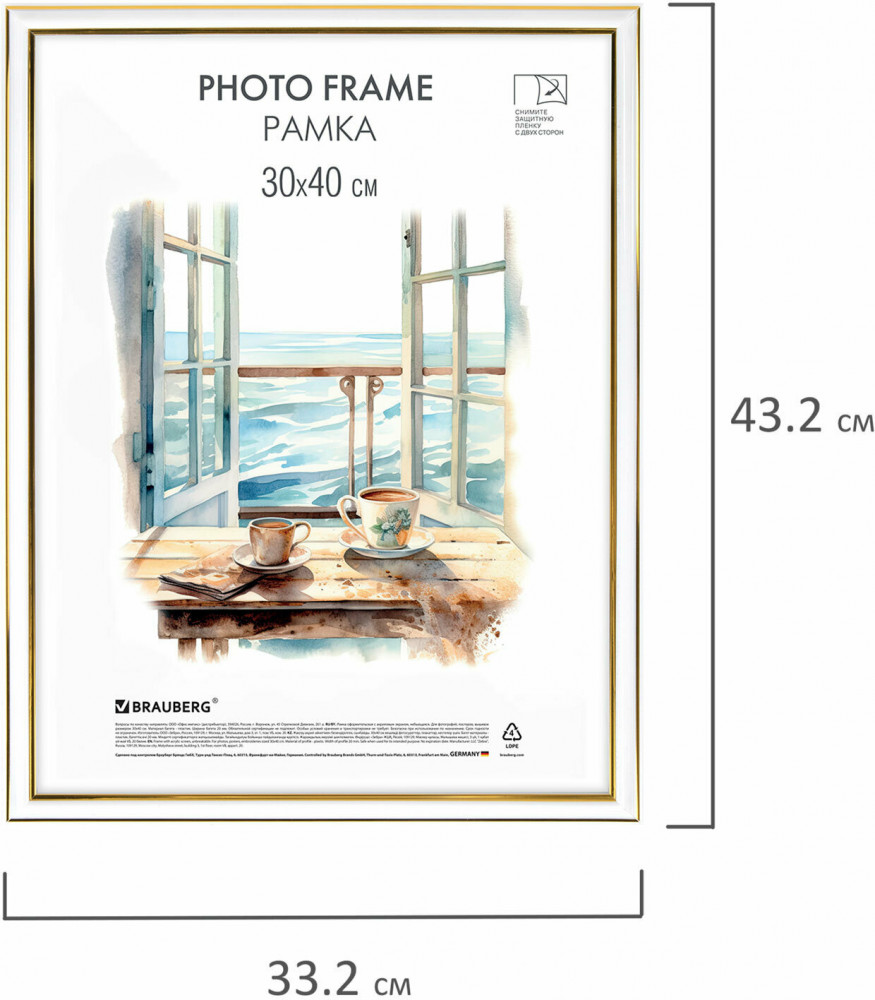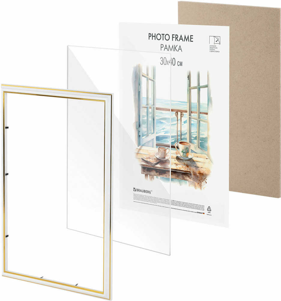 Рамка Brauberg «HIT3» для фотографий, дипломов, сертификатов и других ценных документов благодаря своему дизайну будет гармонично смотреться как в домашнем, так и в офисном интерьере, в магазинах, салонах и других учреждениях. Рамка крупного формата А3 (30×40 см) выполнена из пластика в белом цвете с изюминкой в виде двойных золотистых линий, за счет чего отлично впишется как в домашний, так и в деловой интерьер. Имеется возможность вертикального и горизонтального подвеса. Ширина багета — 20 мм, высота — 14 мм. Вставка из акрила вместо обычного стекла делает рамку менее хрупкой. Перед применением снимите пленку с обеих сторон экрана. Задняя панель выполнена из прочного картона. Рамка поставляется в термоусадочной плёнке, которая гарантирует сохранность рамки при транспортировке, отсутствие сколов и потертостей.