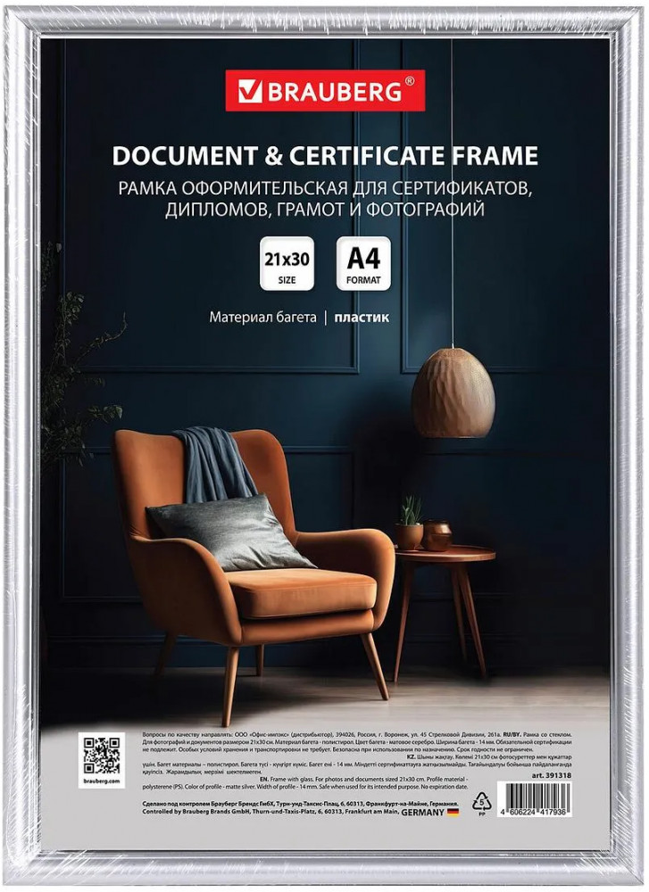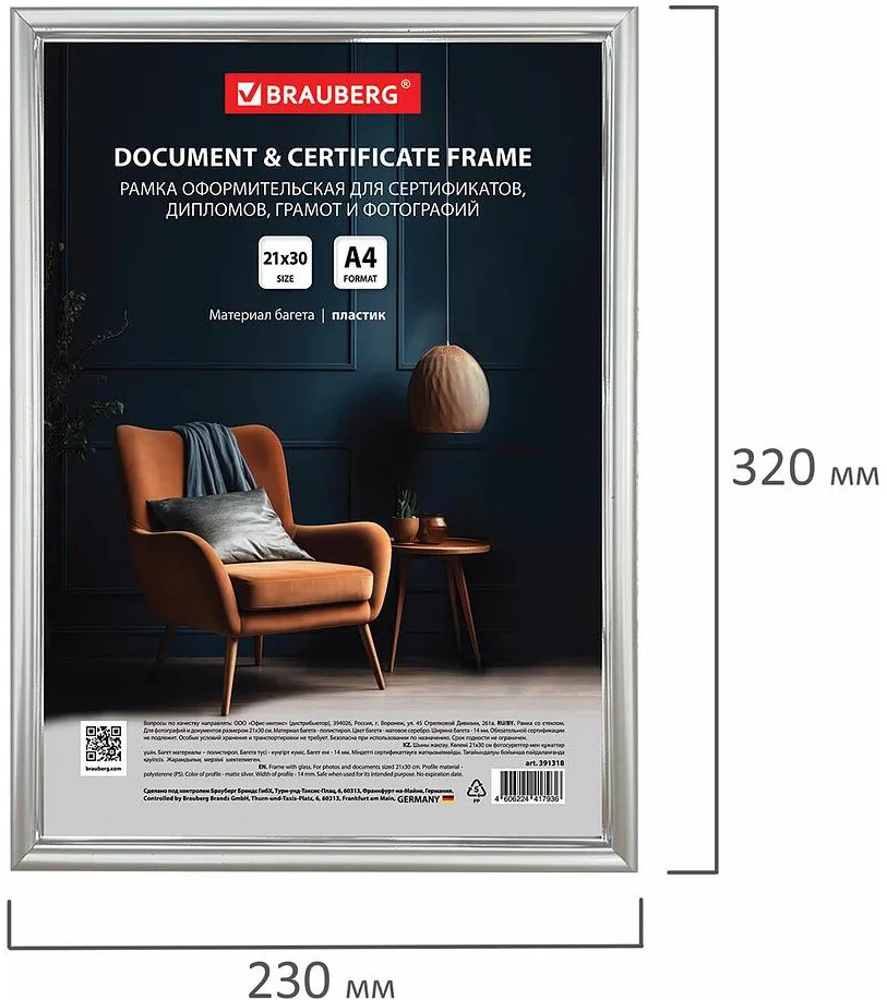 Рамка Brauberg «HIT 2» для оформления фотографий, дипломов, сертификатов, грамот, лицензий и других документов формата А4 (21×30 см) будет гармонично смотреться в любом интерьере — дома, в офисе, в учебных учреждениях и магазинах, в салонах и т.д. Выполнена из комбинации матового серебристого пластика и глянцевого серебристого пластика, за счет чего отлично впишется в домашний и деловой интерьер. Имеется возможность вертикального и горизонтального подвеса. Ширина багета — 14 мм. Аккуратный вид достигается благодаря вставке из стекла. Переплётный картон обеспечивает плотное прилегание содержимого рамки и предотвращает в будущем его деформацию. Термоусадочная пленка гарантирует сохранность рамки при транспортировке, отсутствие сколов и потертостей.