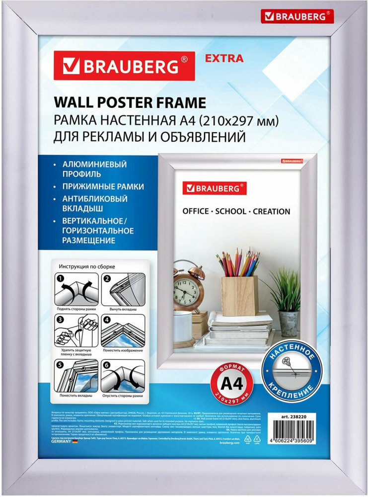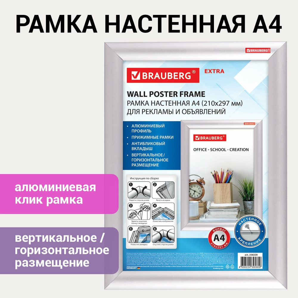 Рамка настенная с защелкивающимся профилем Brauberg «Extra» предназначена для размещения печатных материалов. Идеально подходит для использования в офисе, торговых залах, пунктах выдачи, медицинских и других учреждениях.