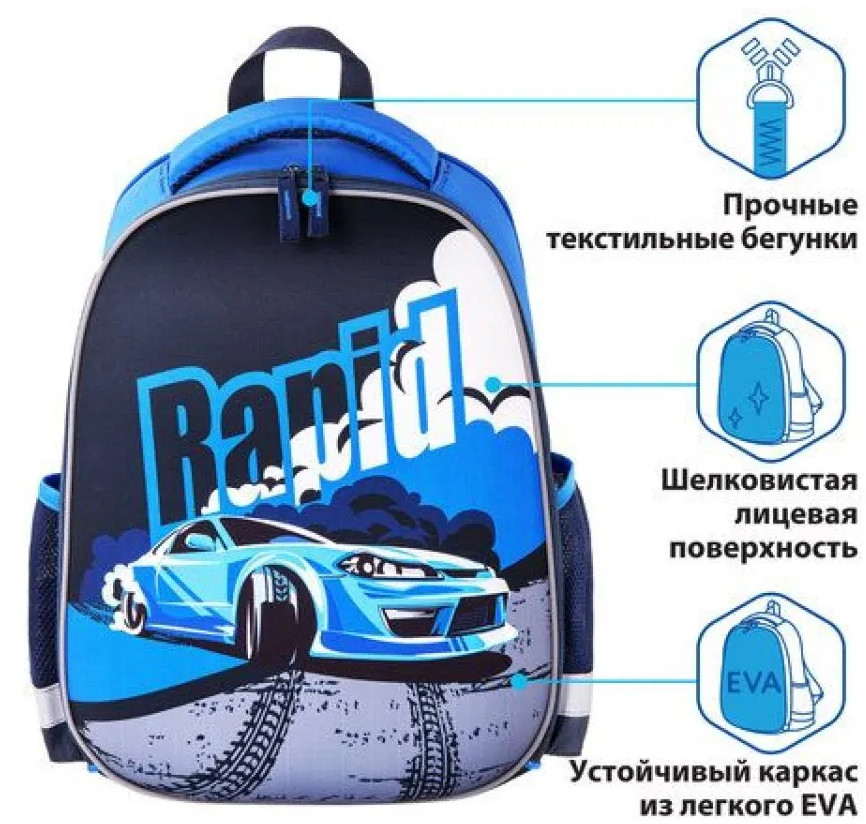 Ранец легко открывать и закрывать одной рукой с любой стороны — основное отделение имеет долговечную реверсивную молнию с двумя бегунками. Нести ранец будет удобно не только на плечах, но и в руке за прочную уплотненную ручку. Также имеется специальная петелька из плетеной нейлоновой нити для подвешивания на крючок парты. Модель имеет боковые карманы на резинке, в которых можно разместить бутылочку, термос или зонт.