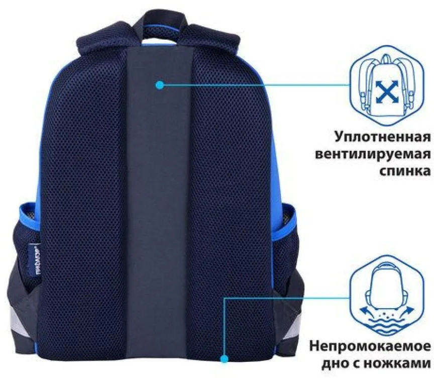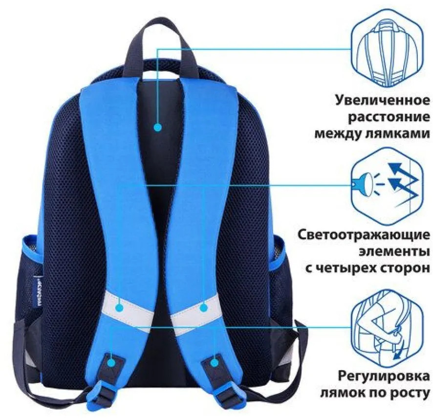 Светоотражающие элементы ранца расположены спереди, на торцах и на лямках. Они необходимы для безопасности пользователя в темное время суток. Дно ранца покрыто плотным полиуретаном для защиты от попадания влаги. Для большей устойчивости в модель добавлены пластиковые ножки. Ранец упакован в плотный ПЭТ пакет с замком Zip Lock с ручками, который сохранит качество и товарный вид при хранении и транспортировке.