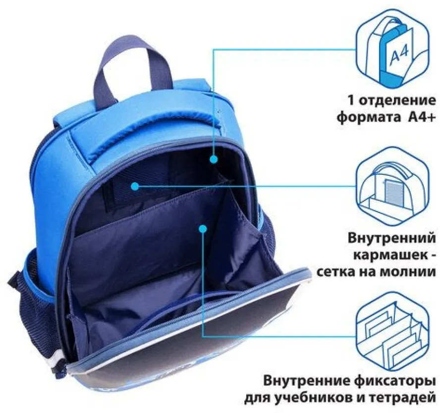В основном отделении ранца можно легко и быстро разместить учебники и тетради, а также воспользоваться большим карманом из сетки и маленьким карманом на молнии для хранения мелочей. Такая организация пространства поможет держать принадлежности в сохранности и приучить ребенка к порядку. Ранец широко раскрывается, повышая удобство использования, а за счёт боковых перегородок содержимое не выскользнет из ранца.