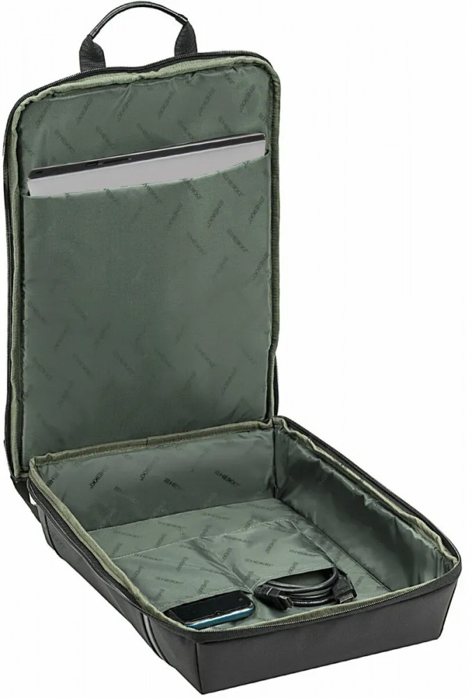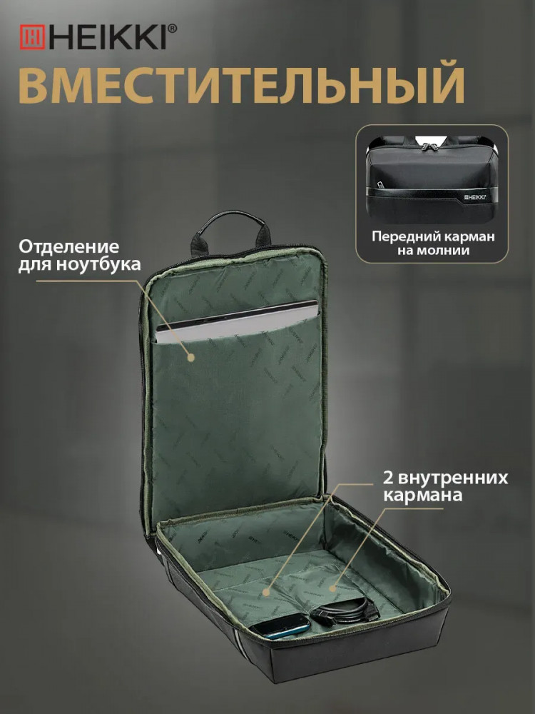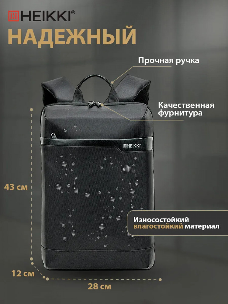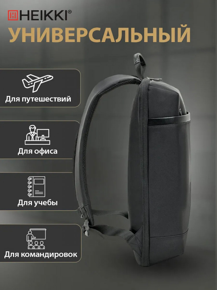 Функциональный и вместительный городской рюкзак Heikki High Tech создан для самых разных жизненных ситуаций. Плотный формоустойчивый каркас обеспечит надежную сохранность содержимого. Сдержанный дизайн уместен в любой сфере использования. Вместительное отделение и 3 кармана позволят упорядоченно разложить большое количество вещей различных размеров, в зависимости от целей использования рюкзака. Важная деталь — это отделение для ноутбука с диагональю экрана до 15,6″. Плотные стенки и дно защитят гаджет от механических повреждений, а эластичная лента на липучке надежно зафиксирует ноутбук. Фронтальная часть имеет карман на молнии. Основное отделение, помимо места для ноутбука, имеет карман для личных вещей — таких как ключи или наушники.