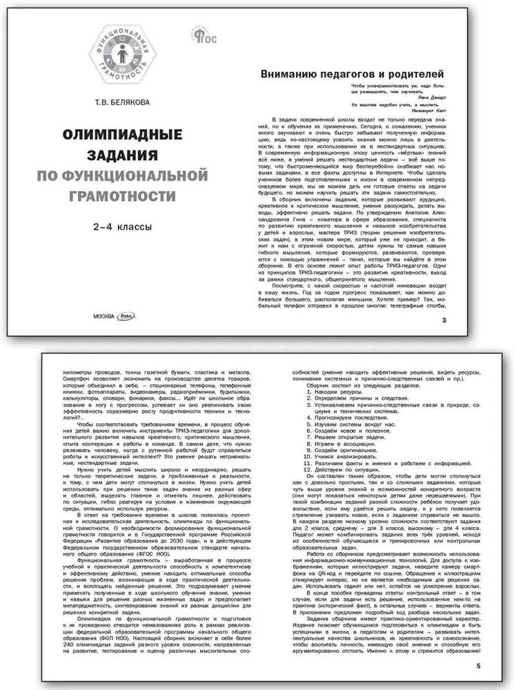 💳 Оплатить за товар можно при получении 🇰🇿 Есть бесплатная доставка по Казахстану от 1 дня 🎁 Копите бонусы с каждой покупки В пособии представлены задания для подготовки и проведения олимпиад по функциональной грамотности школьного уровня в начальных классах общеобразовательных организаций. Сборник включает в себя более 240 заданий различного типа и уровня сложности, направленных на развитие, тестирование и оценку различных мыслительных способностей, с разбором решений и ответами. Содержание заданий направлено на выявление ключевых компетенций функциональной грамотности обучающихся. Сборник адресован учителям, реализующим образовательные программы начального общего образования, ТРИЗ-педагогам, преподавателям и студентам педагогических специальностей среднего профессионального и высшего образования, а также родителям обучающихся. |