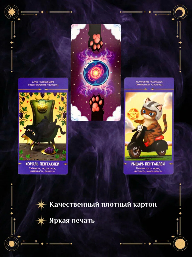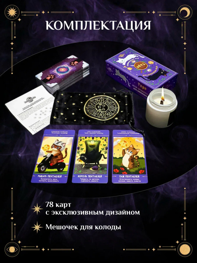 Миленд Таро «Коты предсказатели»В данный момент этот товар отсутствует в продаже. Возможно, у нас найдется аналогичный или похожий товар здесь. Карты Таро «Коты предсказатели» представляют собой уникальный инструмент для гаданий и предсказаний. Они просты в использовании и подходят для людей с любым уровнем опыта в области эзотерики. В колоде содержится 78 карт, что позволяет получить ответы на самые разные вопросы. Карты Таро «Коты предсказатели» помогут прояснить события прошлого, настоящего и будущего, а также дадут возможность заглянуть в будущее и узнать, что ждет вас завтра. Карты Таро «Коты предсказатели» поставляются в комплекте с удобным мешочком для хранения колоды. Это позволяет сохранить карты в хорошем состоянии и защищает их от повреждений. Карты Таро «Коты предсказатели» — это отличный выбор для тех, кто хочет научиться гадать и получать точные предсказания. Они просты в использовании, удобны в хранении и помогут вам раскрыть тайны будущего. |
