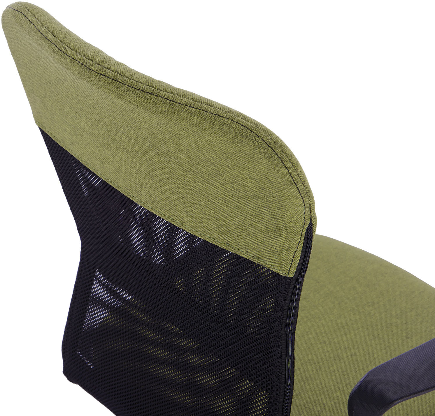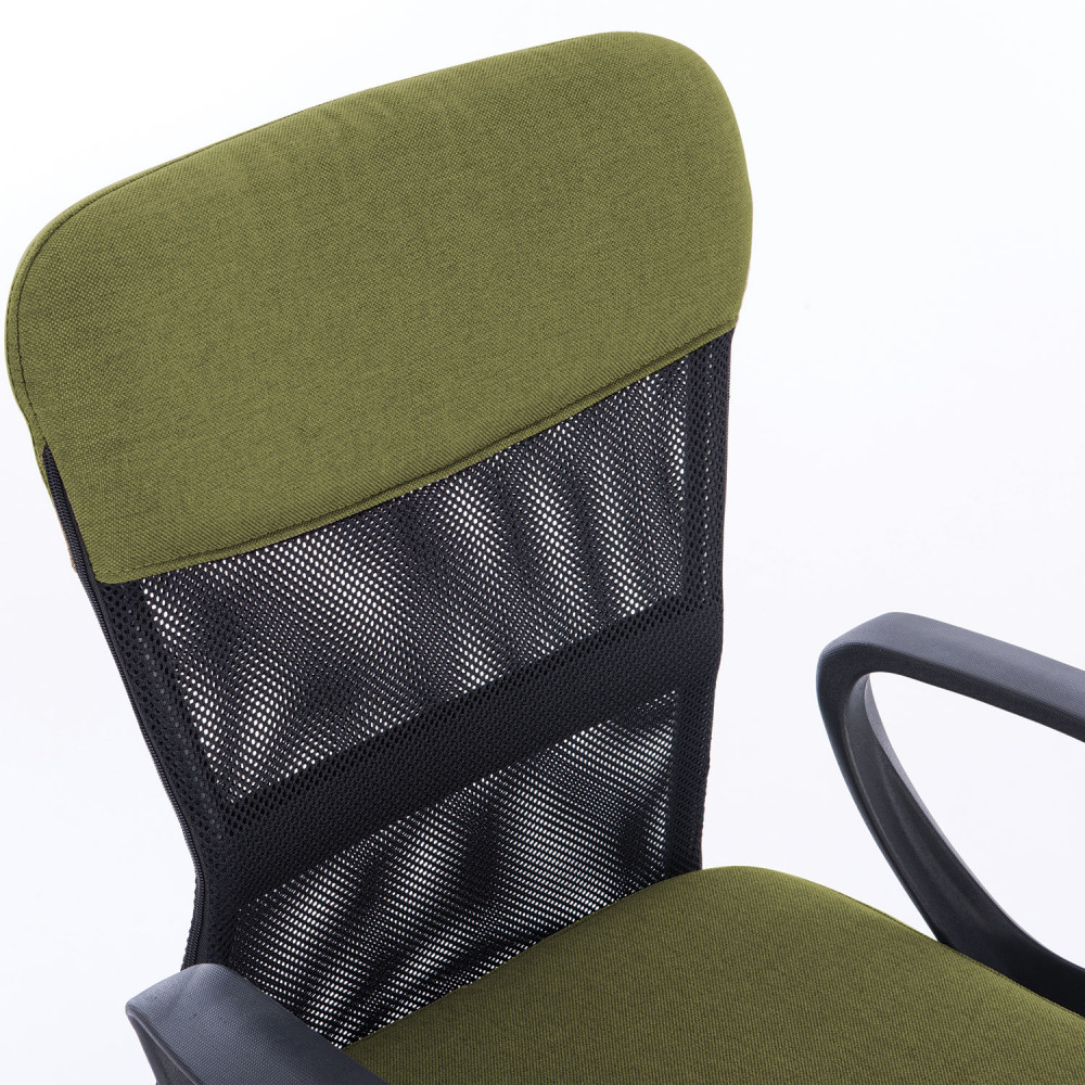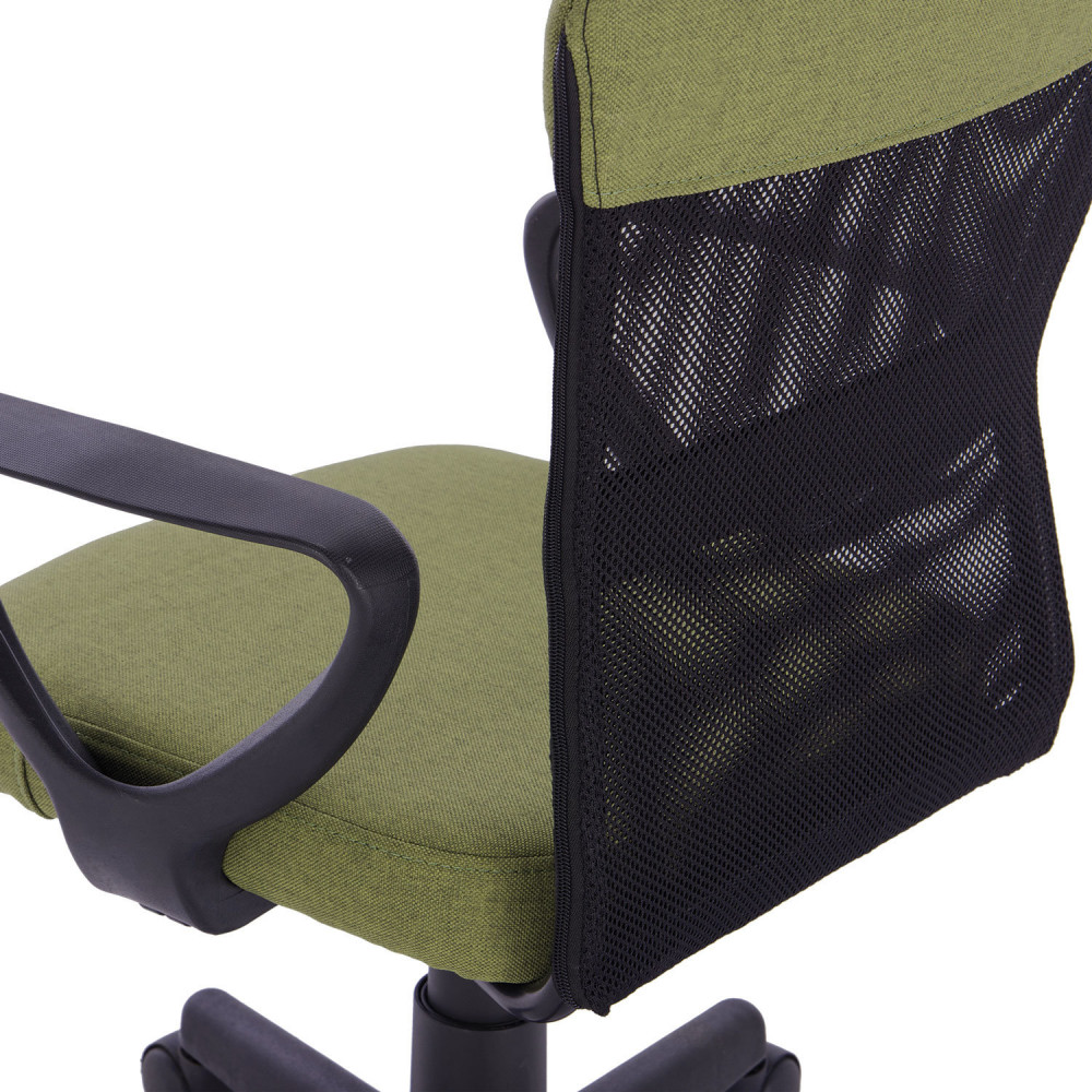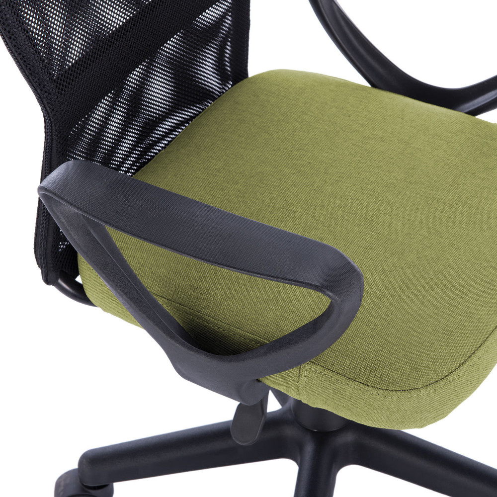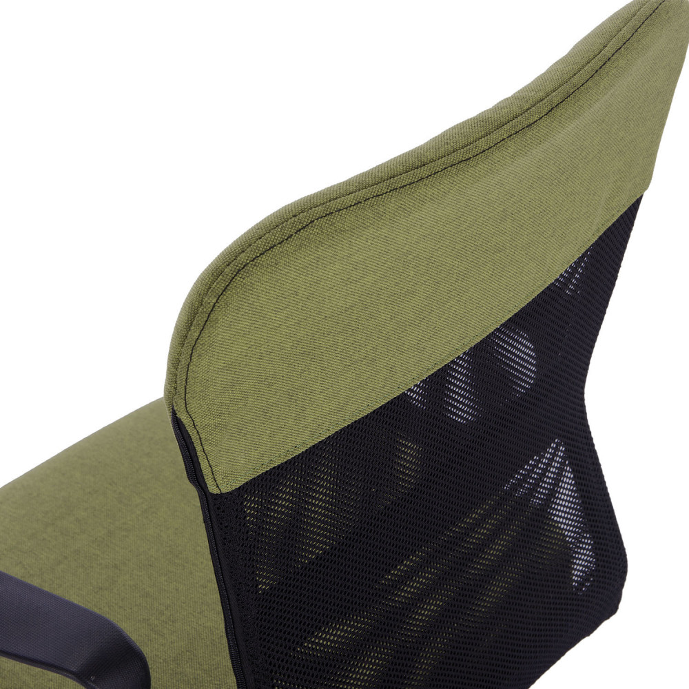 Верхняя, наиболее подверженная износу, часть спинки усилена вставкой из прочной мебельной ткани. Она же использована в обивке сиденья. Материал хорошо пропускает воздух, устойчив к износу, долго сохраняет цвет, неприхотлив в уходе. Также в области поясницы предусмотрена специальная вставка из эластичной ленты для дополнительной поддержки спины. Каркас спинки изготовлен из двух металлических труб вставленных друг в друга — это уникальное конструкторское решение позволяет добиться высоких показателей жесткости. В основании кресла прочное пластиковое пятилучие и надежный газпатрон. Конструкцией предусмотрена нагрузка до 100 кг.