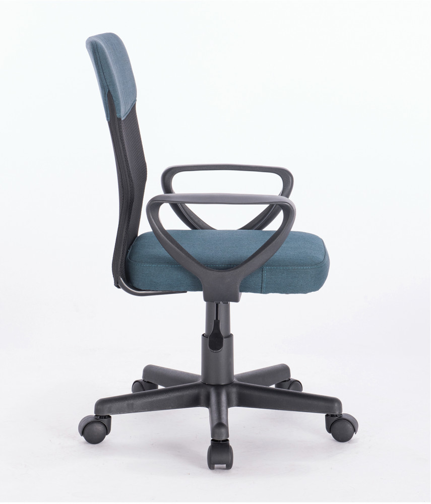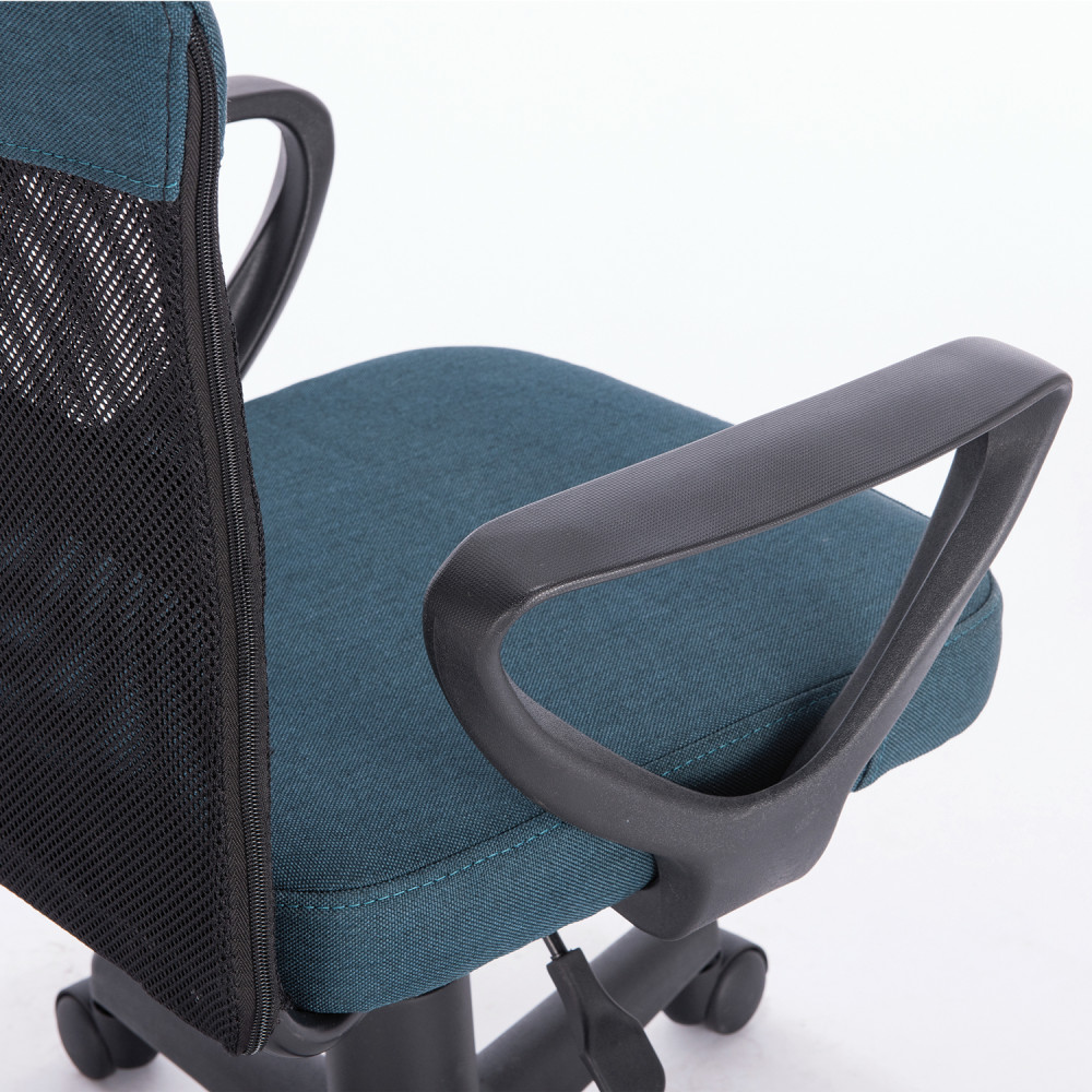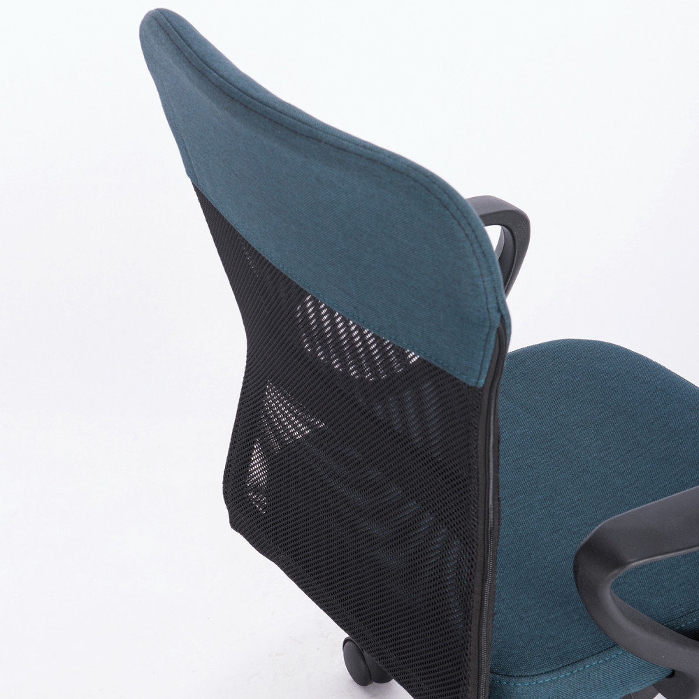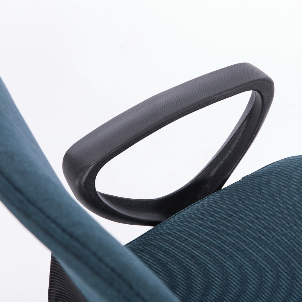 Верхняя, наиболее подверженная износу, часть спинки усилена вставкой из прочной мебельной ткани. Она же использована в обивке сиденья. Материал хорошо пропускает воздух, устойчив к износу, долго сохраняет цвет, неприхотлив в уходе. Также в области поясницы предусмотрена специальная вставка из эластичной ленты для дополнительной поддержки спины. Каркас спинки изготовлен из двух металлических труб вставленных друг в друга — это уникальное конструкторское решение позволяет добиться высоких показателей жесткости. В основании кресла прочное пластиковое пятилучие и надежный газпатрон. Конструкцией предусмотрена нагрузка до 100 кг.