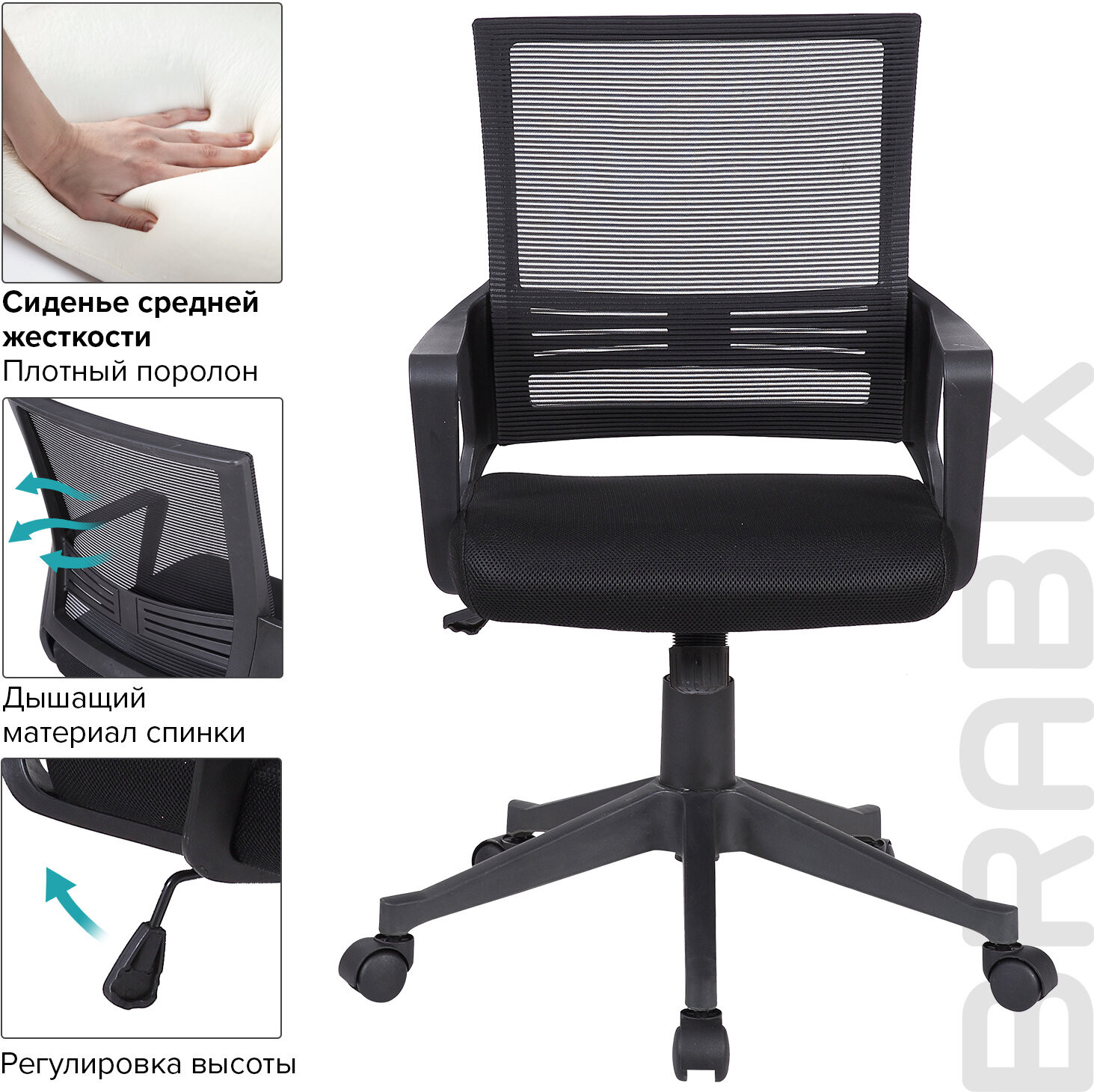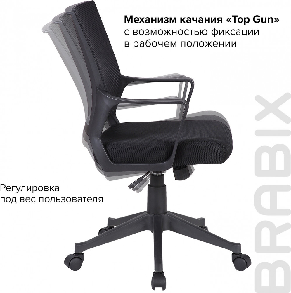В обивке сиденья использована технологичная ткань серии TW — сложный композитный материал толщиной 5-7 мм, состоящий из нескольких слоев тканных и нетканых компонентов. Материал отлично пропускает воздух, устойчив к износу, долго сохраняет цвет, неприхотлив в уходе. Кресло оснащено механизмом качания «топ-ган» с регулировкой под вес пользователя и возможностью фиксации спинки в рабочем положении. В основании крела прочное пластиковое пятилучие и надежный газпатрон. Конструкцией предусмотрена нагрузка до 100 кг. Офисное кресло Brabix «Balance MG-320» — необходимый атрибут комфортной работы! Оформляйте заказ и присоединяйтесь к тысячам других счастливых пользователей!