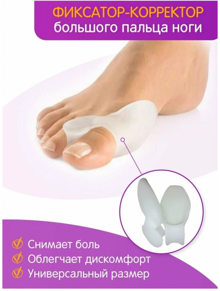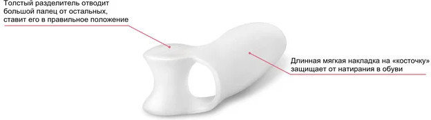 Гелевый фиксатор представляет собой мягкую накладку, выполненную из эластичного материала. В центре находится отверстие для большого пальца. Текстура материала позволяет подстраиваться фиксатору под форму стопы, тем самым предупреждая возможные неудобства. Благодаря уникальной форме фиксатора большой палец не отклоняется от нормального, то есть анатомически естественного, положения. Постепенно «косточка» встает на место.