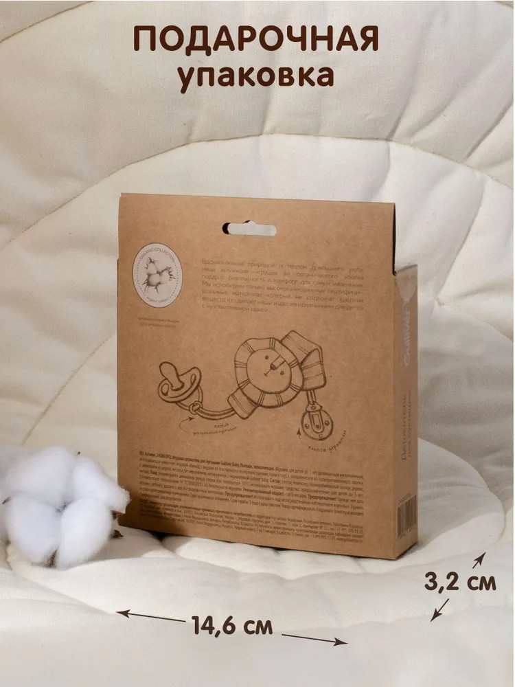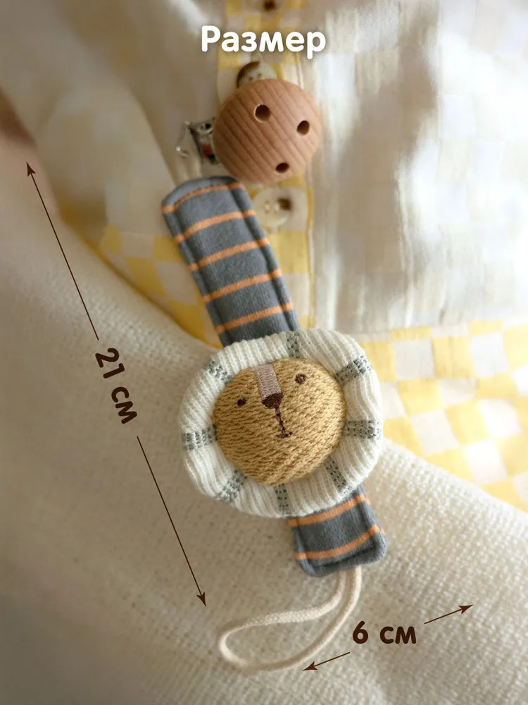 💳 Оплатить за товар можно при получении 🇰🇿 Есть бесплатная доставка по Казахстану 🎁 Копите бонусы с каждой покупки Игрушка-держатель для пустышки от бренда Gulliver Baby изготовлена из мягкого органического хлопка, приятного на ощупь и безопасного для малыша. Пустышка крепится с помощью петли, а надежная клипса-зажим позволяет зафиксировать ее на любом предмете: одежде, коляске, кроватке. Теперь любимая пустышка всегда будет под рукой у малыша и не потеряется. Это особенно важно для активных детей, которые любят исследовать мир вокруг себя. Элемент в виде мордочки милого львенка, несомненно, будет привлекать внимание ребенка и стимулировать зрительные и сенсорные навыки. |