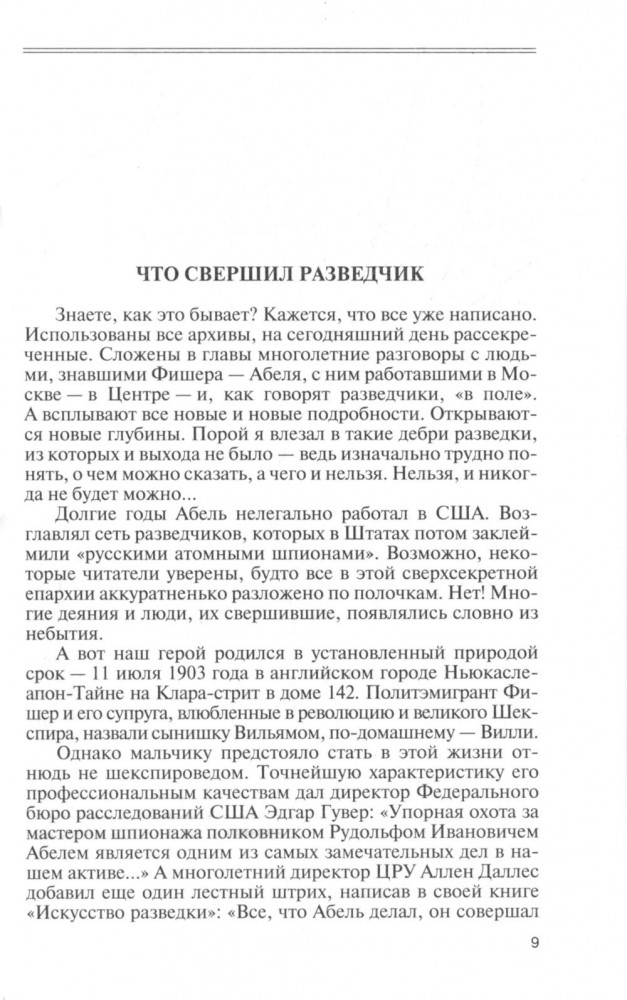 Хотя Вильям Генрихович Фишер (1903-1971) и является самым известным советским разведчиком послевоенного времени, это имя знают не очень многие. Ведь он, резидент советской разведки в США в 1948-1957 годах, вошел в историю как Рудольф Иванович Абель. Большая часть биографии легендарного разведчика до сих пор остается под грифом «совершенно секретно». Книга, расширенная и дополненная новыми материалами, открывает читателю максимально возможную информацию о жизни и деятельности Вильяма Фишера. Работая над книгой, автор, трижды лауреат литературной премии СВР России, лауреат Всероссийской историко-литературной премии Александра Невского, общался со многими людьми, знавшими Вильяма Генриховича. В повествование вошли уникальные воспоминания дочерей Вильяма Фишера, его коллег — уже ушедших из жизни Героев России Владимира Барковского, Леонтины и Морриса Коэн, а также других прославленных разведчиков, в том числе и тех, чьи имена до сих пор остаются «закрытыми».