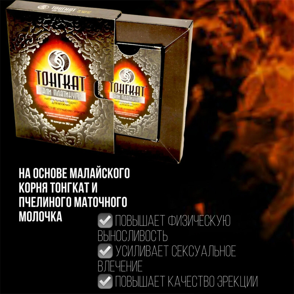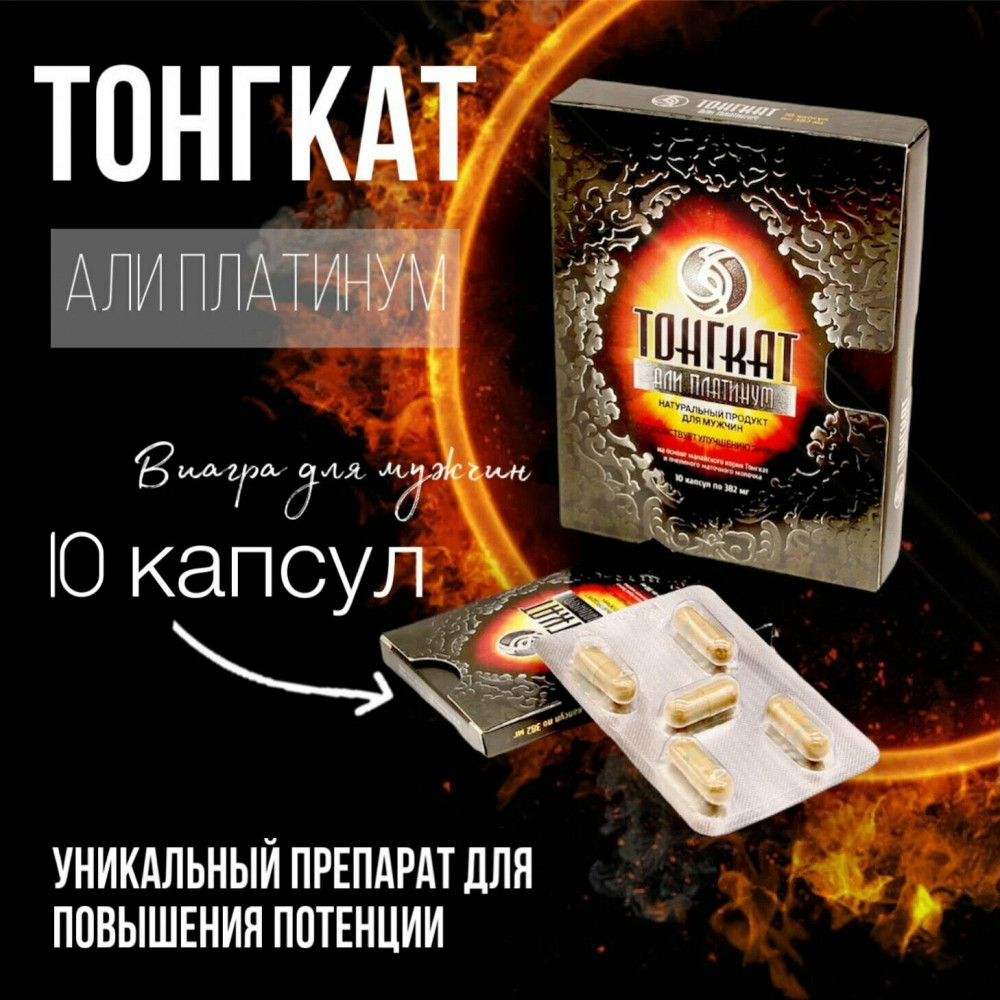 Уникальный препарат для повышения потенции, созданный на основе легендарного корня Тонгкат, который мужчины Малайзии используют с древнейших времён (Золотой Корень Али) — один из самых действенных препаратов для решения проблем половой функции у мужчин. Тонгкат Али Платинум усиливает сексуальное желание, укрепляет эрекцию, продлевает половой акт, увеличивает половую чувствительность, усиливает оргазм. Улучшает кровообращение в органах малого таза. Стимулирует иммунитет. Улучшает общее самочувствие, снимает умственную усталость, повышает работоспособность. Препарат начинает действовать через 1-2 часа и результаты сохраняются в течение 3-7 суток.