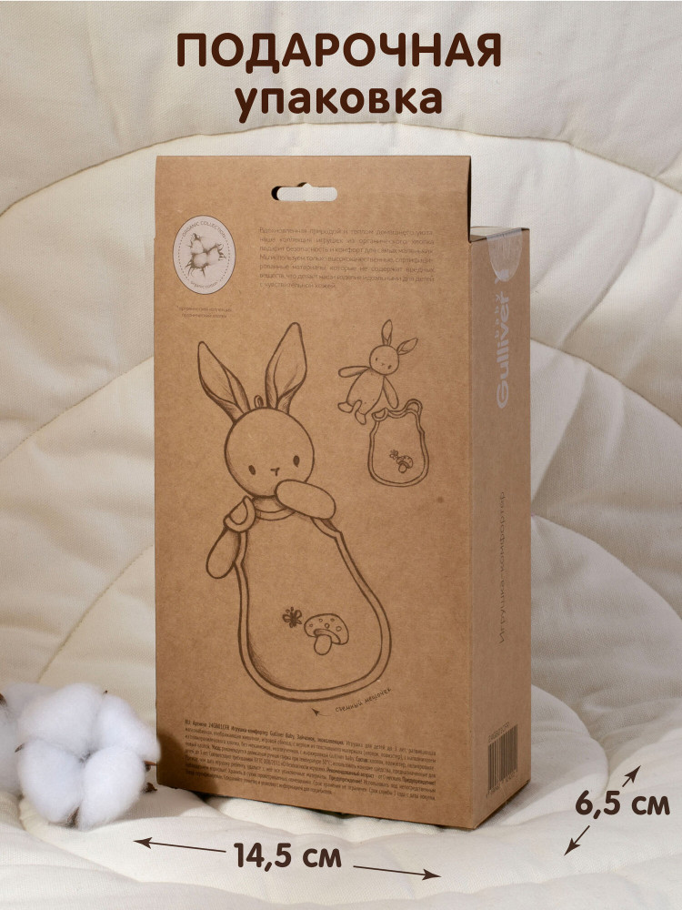 💳 Оплатить за товар можно при получении 🇰🇿 Есть бесплатная доставка по Казахстану от 1 дня 🎁 Копите бонусы с каждой покупки В первые месяцы жизни ребенок особенно нуждается в чувстве безопасности и комфорта. Родители прилагают все усилия, чтобы создать для малыша уютную и спокойную атмосферу. В этом им поможет комфортер Gulliver Baby, который станет верным другом и помощником в период адаптации малыша к новому миру. Мягкая игрушка для засыпания в виде очаровательного зайчонка выполнена из мягкого и экологичного органического хлопка и нежного велюра и не раздражает чувствительную кожу. Ткани разной фактуры развивают тактильное восприятие. Съемный мешочек, в котором прячется маленький зайка, способствует развитию мелкой моторики у ребенка. Малыш с удовольствием будет снимать и надевать мешочек, тренируя координацию движений. |