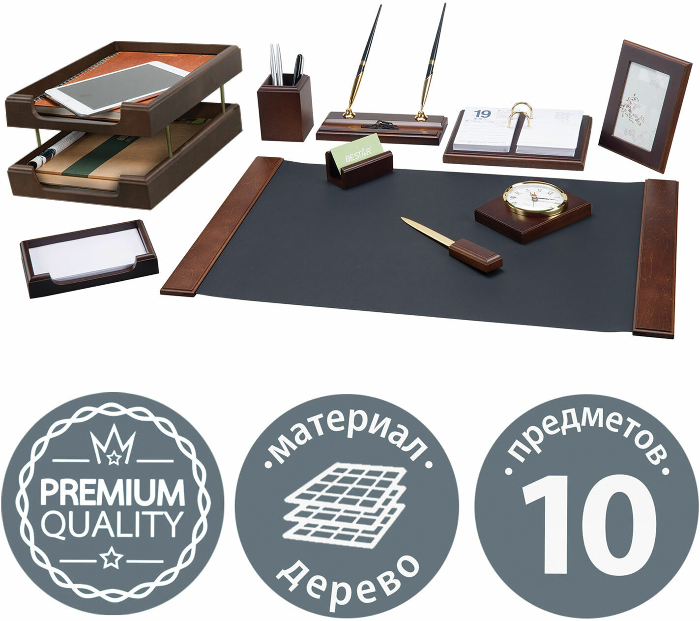 Настольный набор премиум-класса Bestar «Artemis» — оригинальный подарок, отличающийся утонченным стилем и совершенством деталей. Все предметы изготовлены из дерева с золотистой фурнитурой. Набор упакован в подарочную коробку. Настольный набор Bestar «Artemis» подчеркнет изысканный вкус и статус владельца. Не медлите, выбирайте настольный набор Bestar и позвольте себе насладиться истинным совершенством!