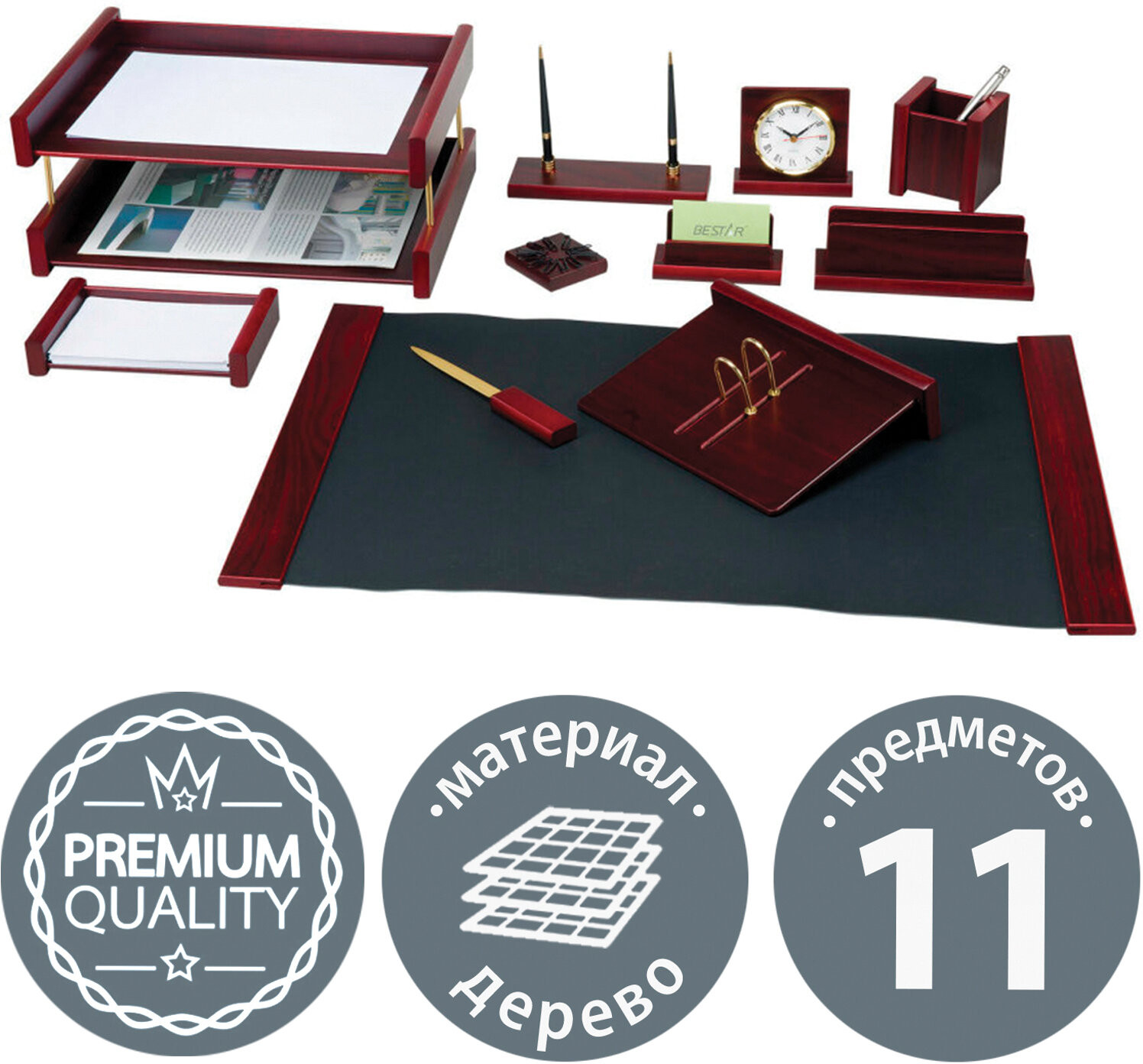Настольный набор премиум-класса Bestar «Platon» — оригинальный подарок, отличающийся утонченным стилем и совершенством деталей. Все предметы изготовлены из дерева с золотистой фурнитурой. Набор упакован в подарочную коробку. Настольный набор Bestar «Platon» подчеркнет изысканный вкус и статус владельца. Не медлите, выбирайте настольный набор Bestar и позвольте себе насладиться истинным совершенством!