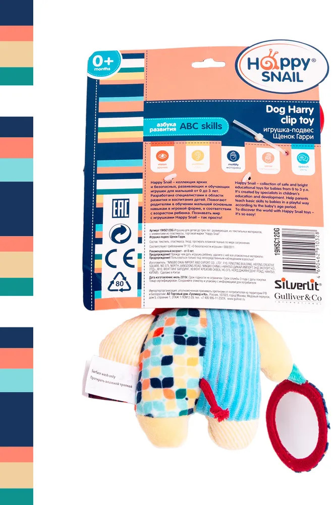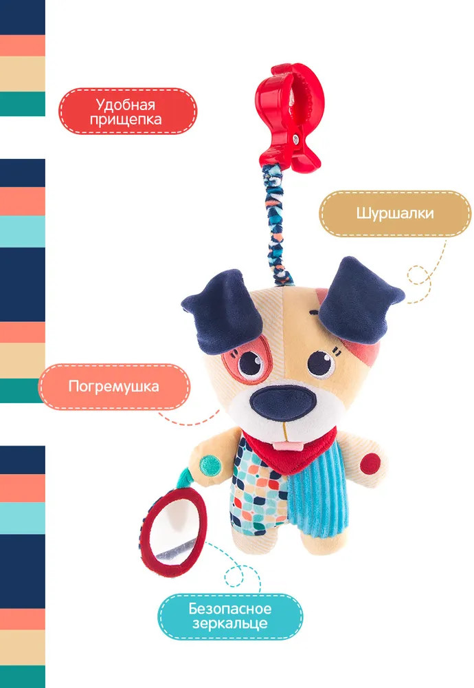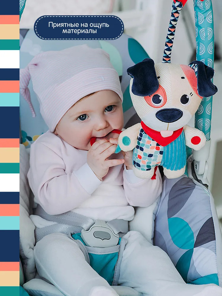 💳 Оплатить за товар можно при получении 🇰🇿 Есть бесплатная доставка по Казахстану от 1 дня 🎁 Копите бонусы с каждой покупки Игрушка-подвес «Щенок Гарри» от Happy Snail имеет множество разноцветных деталей, выполнена из материалов различной фактуры и включает сразу несколько развивающих элементов. В лапке щенок держит безопасное зеркальце, внутри спрятаны шуршащие элементы и погремушка, а крепится игрушка с помощью крепления типа «краб» на эластичном шнурке. Шнурок растягивается, и если отпустить игрушку, он возвращается на место. Мордочка щенка полностью вышита нитками. Игрушка не имеет твердых деталей, поэтому подходит для новорожденных детей. Способствует развитию визуального и слухового восприятия, а также тактильных навыков. |