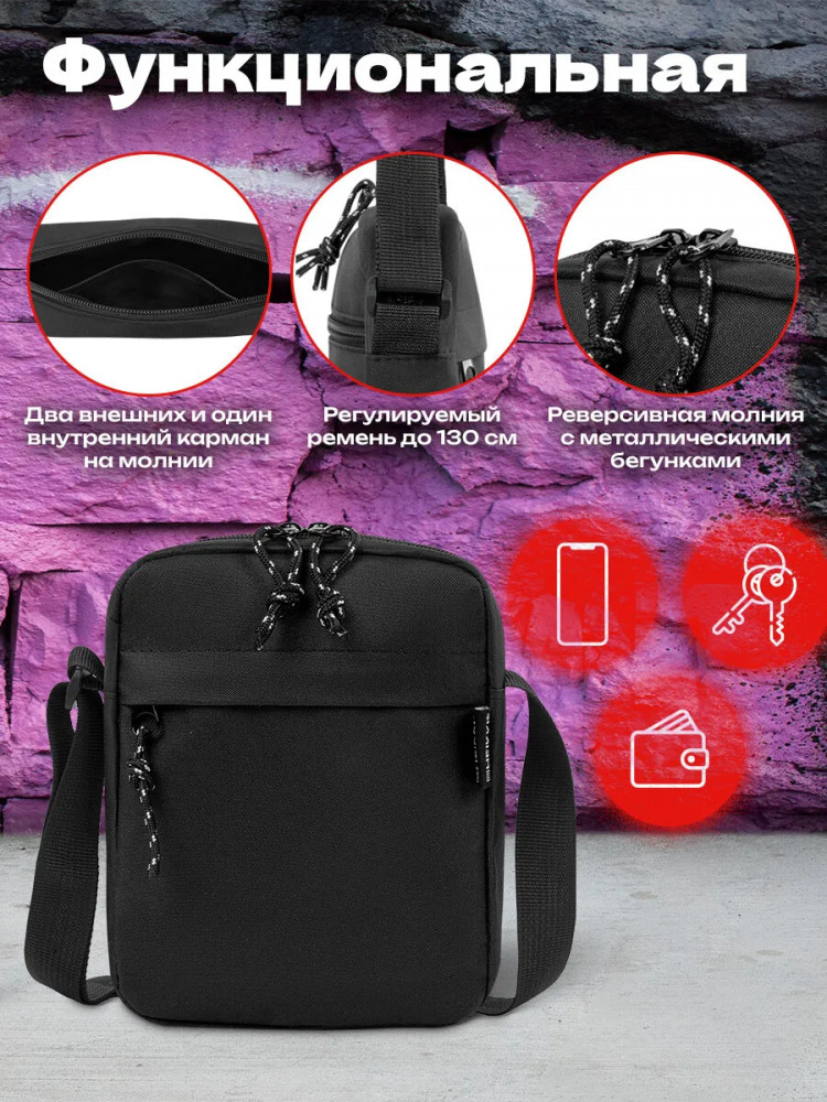 Сумка на плечо Heikki Compact — компактный и практичный аксессуар для повседневной носки, прогулок, бега, путешествий. Универсальный аксессуар для дополнения любого образа. Легкая и удобная в использовании сумка на плечо, сумка кросс-боди. Несмотря на компактный размер, вмещает много разных предметов: телефон, ключи, документы, наушники и многие другие вещи небольших размеров. Одно отделение, два кармана для оптимальной организации пространства. На фронтальной части расположен карман на молнии, во внутреннем отделении находится небольшой карман, в котором можно разместить личные вещи. Удобная регулировка длины ремня производится с помощью пряжки, выполненной из качественного пластика. Максимальная длина — 120 см.