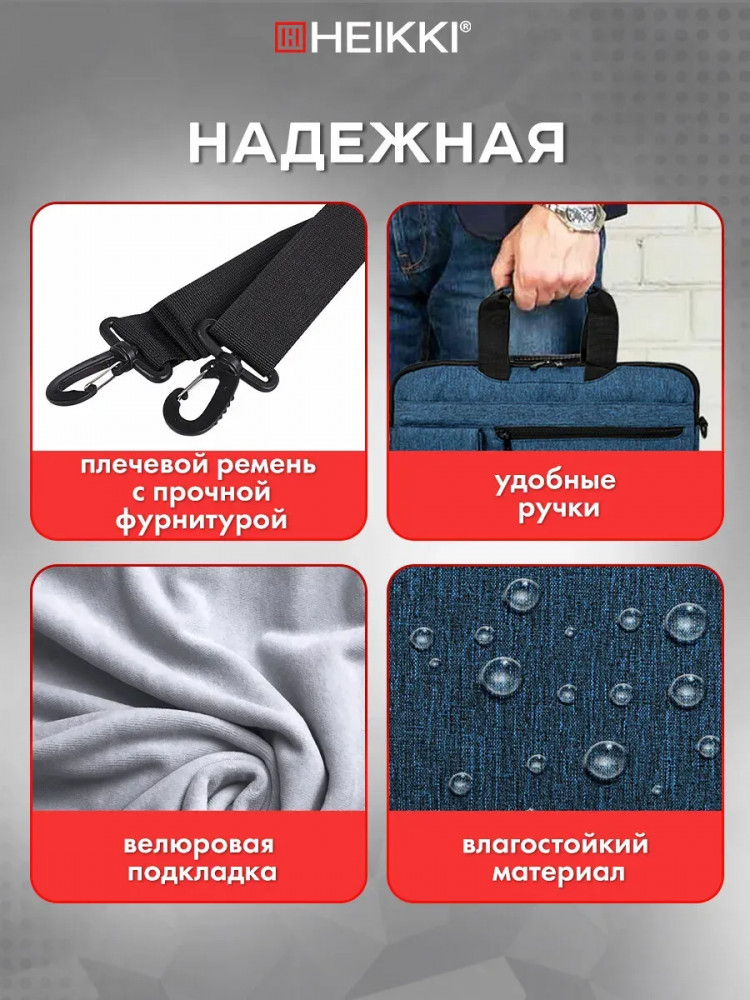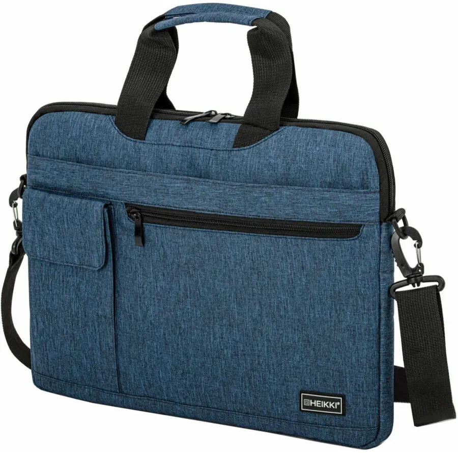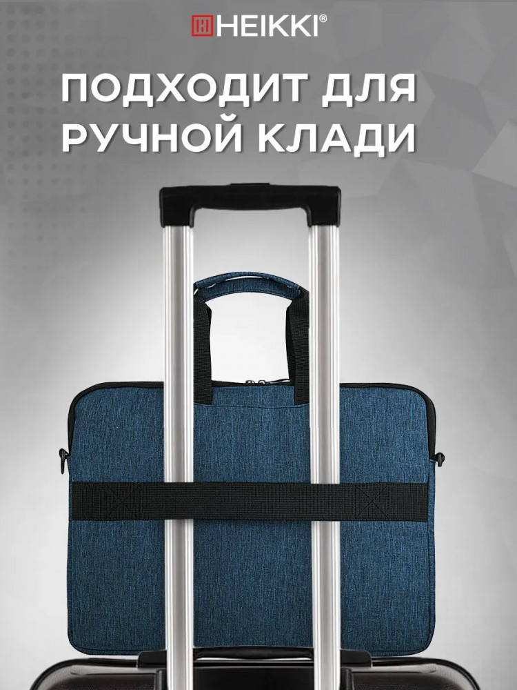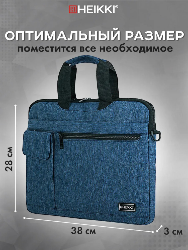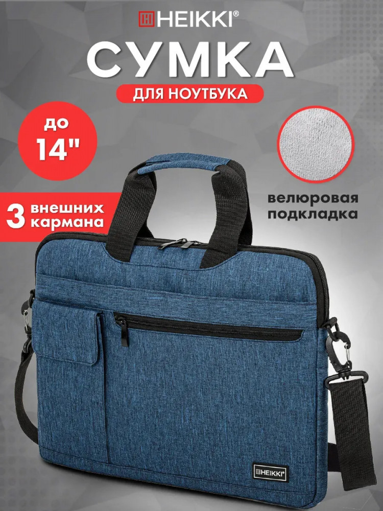 Компактная и функциональная сумка Heikki Novation — отличное решение для переноски ноутбука с диагональю экрана до 14″, планшета, документов формата А4, презентаций и других необходимых вещей. Наружные карманы и специальное отделение для ноутбука позволяют упорядоченно разложить множество необходимых вещей помимо электронного устройства. Стенки и дно уплотнены толстым слоем специальной амортизирующей пены, что позволяет защитить гаджет от механических повреждений. Имеются 3 кармана для быстрого доступа к самым необходимым вещам. Карман с клапаном на липучке для смартфона и 2 кармана на молнии послужат для организации как личных вещей, так и комплектующих для ноутбука. Багажная лента позволяет зафиксировать сумку на телескопической ручке чемодана для удобного перемещения нескольких предметов багажа.