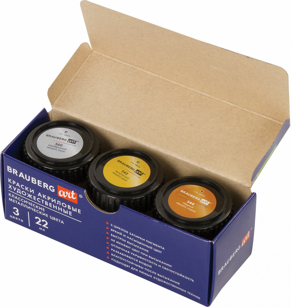 Акриловая художественная краска Brauberg Art Classic — профессиональная серия. Предназначена для живописи и декоративных работ. Легко наносится практически на любую поверхность. Яркий и насыщенный цвет. Быстрое высыхание без изменения цвета. Краски с эффектом «металлик». Легко наносятся практически на любую поверхность. Быстрое высыхание без изменения цвета. Отличная укрывистость и светостойкость. Разбавляются водой. Не токсичны и не имеют неприятного резкого запаха. Краски поставляются в банках объемом 22 мл в картонной коробке.