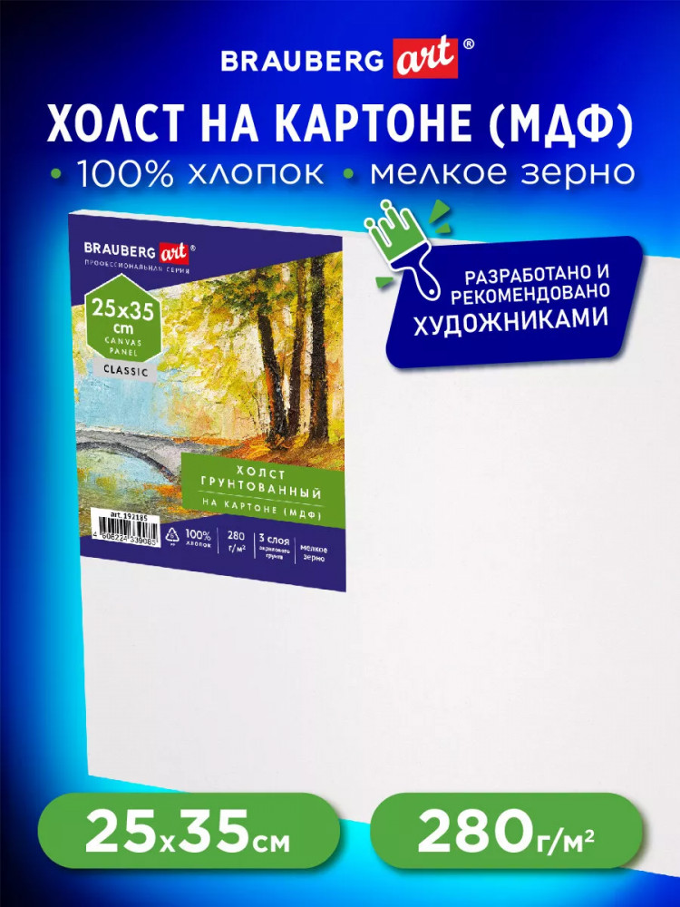 Серия: Classic Грунтованный холст на МДФ Brauberg Art Classic используется для работы масляными, темперными и акриловыми красками. Предназначен как для начинающих художников, учеников и студентов художественных школ, так и для профессионалов. Прочная поверхность холста выдерживает множество слоев краски и воздействие разбавителей, хорошо переносит изменения влажности и температуры. Грунтованное мелкозернистое полотно из 100% хлопка плотностью 280 г/м2 наклеено на основу из МДФ. Холст на МДФ легче и меньше по сравнению с холстами на подрамнике, тем самым он очень удобен для транспортировки. В то же время холст на МДФ прочнее холста на картоне. Размер — 25×35 см.