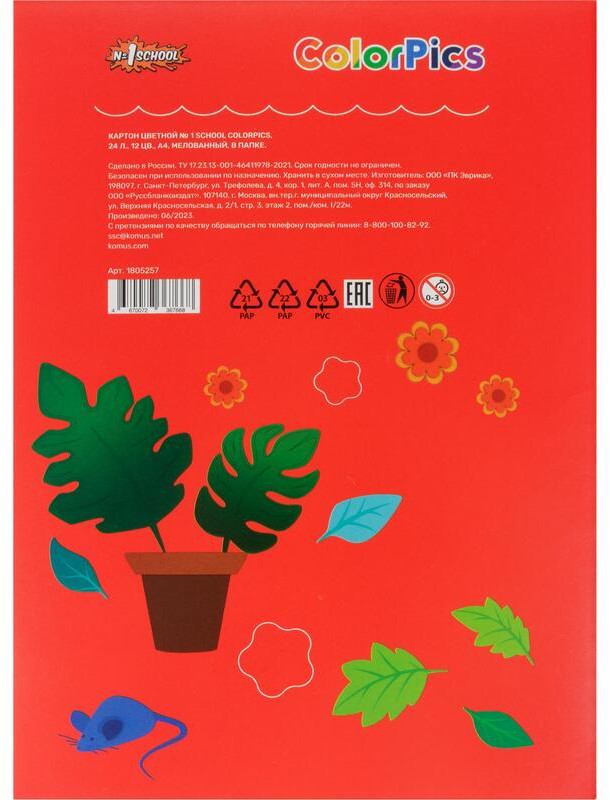 💳 Оплатить за товар можно при получении 🇰🇿 Есть бесплатная доставка по Казахстану от 1 дня 🎁 Копите бонусы с каждой покупки Серия: Школьные товары ColorPics Картон цветной «ColorPics» (203×283 мм, 24 листа, 12 цветов, мелованный). Набор цветного картона формата 203×283 предназначен для творчества и хобби и может использоваться детьми с трехлетнего возраста. Картон рекомендован для уроков труда и технологии. Мелованный глянцевый картон с серым оборотом с улучшенной прокраской обладает плотностью 200 г/кв.м. Каждый набор упакован в красочную картонную папку. Картон легко режется ножницами, сгибается и клеится. Цветной картон — это самый доступный и универсальный материал для детского творчества. |