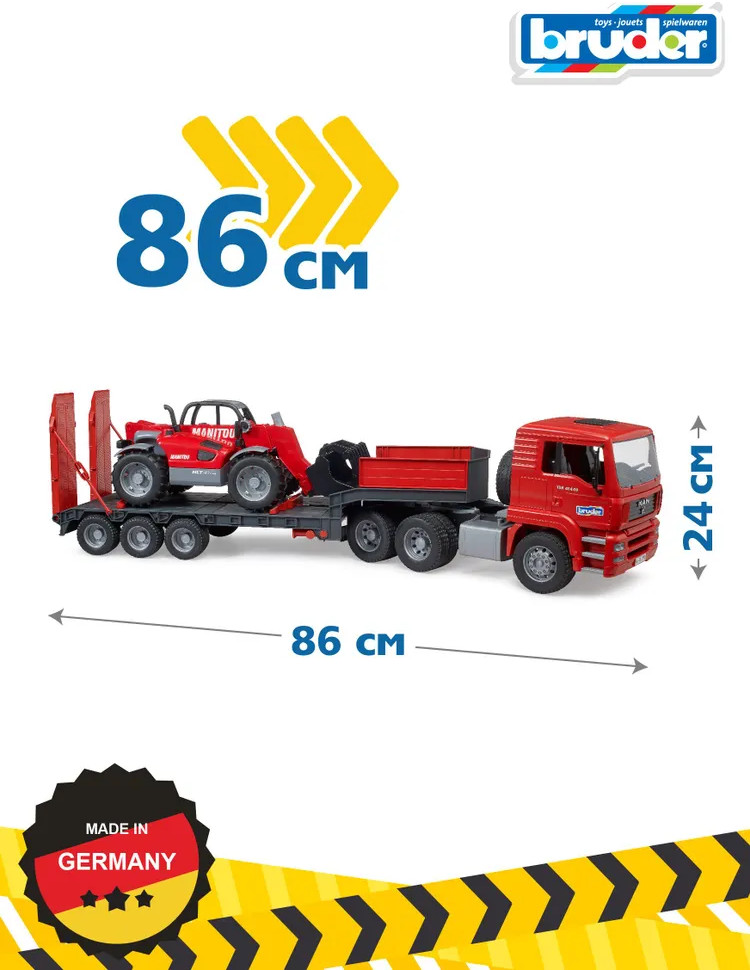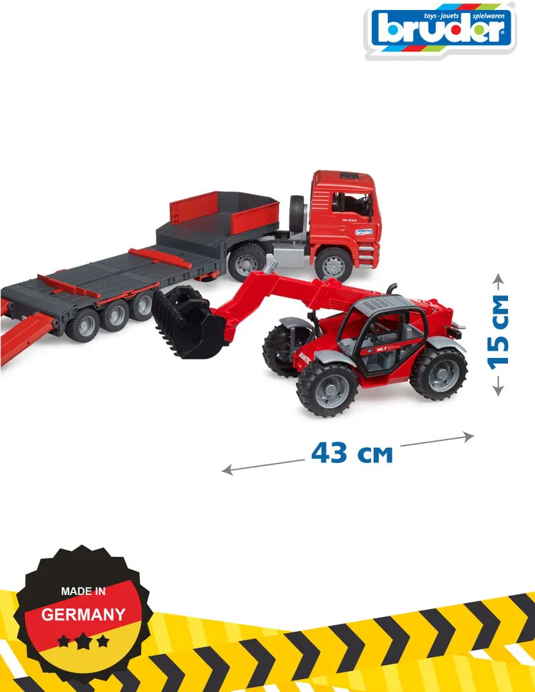 💳 Оплатить за товар можно при получении 🇰🇿 Есть бесплатная доставка по Казахстану от 1 дня 🎁 Копите бонусы с каждой покупки Набор игровой Bruder — отличный подарок для мальчика любого возраста. Автомобили и специальная техника немецкого производителя вызывают восхищение детей, игрушки долговечные и надежные. Низкорамные прицепы часто используются для выполнения тяжелых транспортных задач, таких как транспортировка крупных строительных машин со строительной площадки на строительную площадку. Этот впечатляющий автомобиль обладает знакомыми характеристиками низкорамного грузовика MAN: полнофункциональное поворотное сцепное устройство полуприцепа, складные опоры и передвижные пандусы. Входящий в комплект управляемый телескопический погрузчик имеет выдвижную и регулируемую по высоте телескопическую стрелу, а также съемный ковш. |