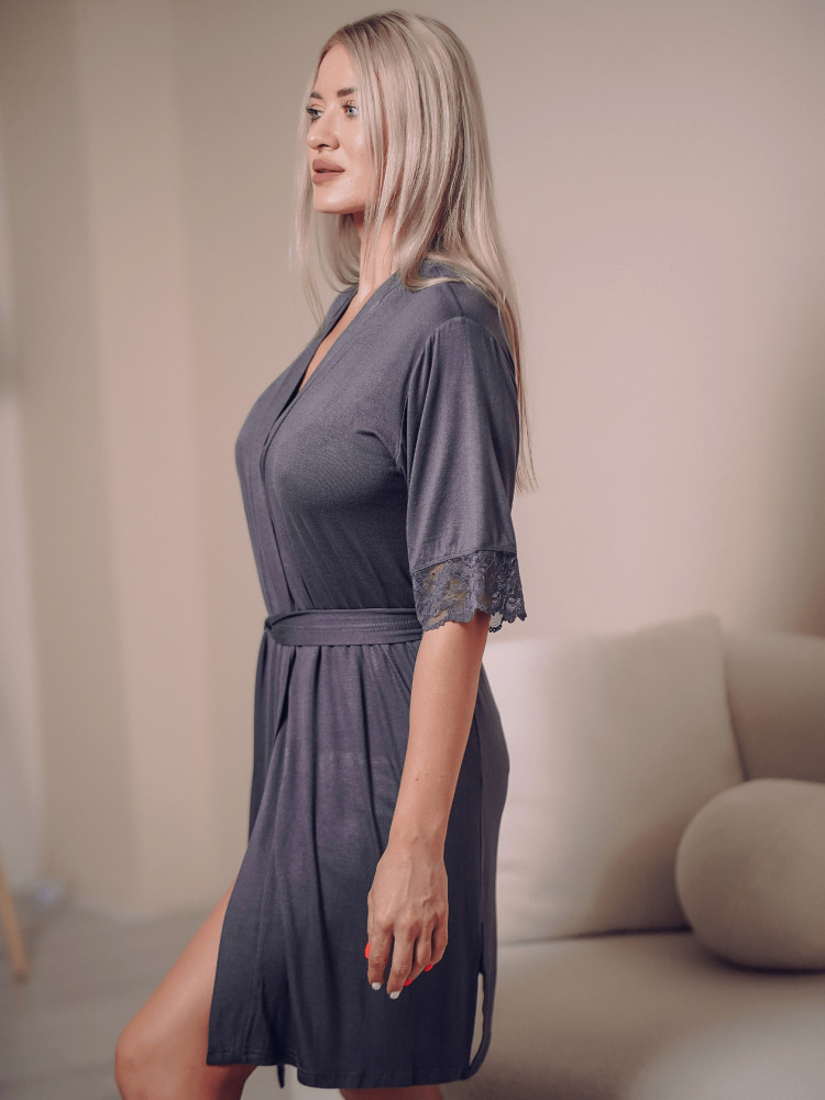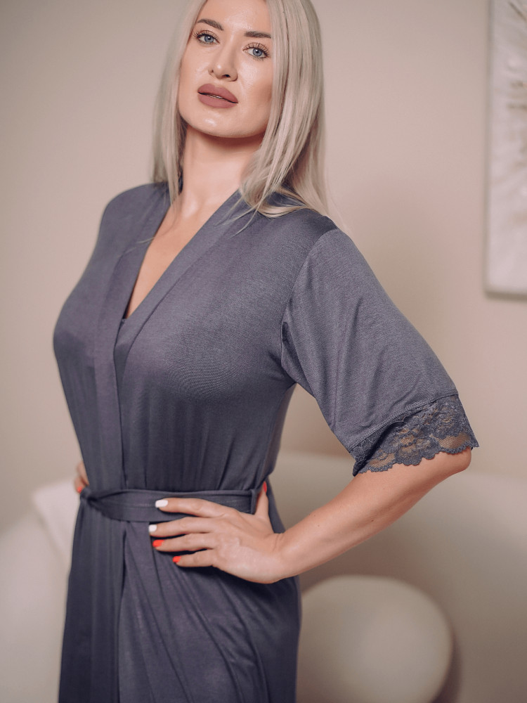 Красивый халат. Материал очень приятен к телу. Качество пошива и гипюра на рукавах хорошее. Если хотите чтобы был посвободнее, берите на размер больше своего. Я ношу 44 рр, взяла 46, хорошо сидит.