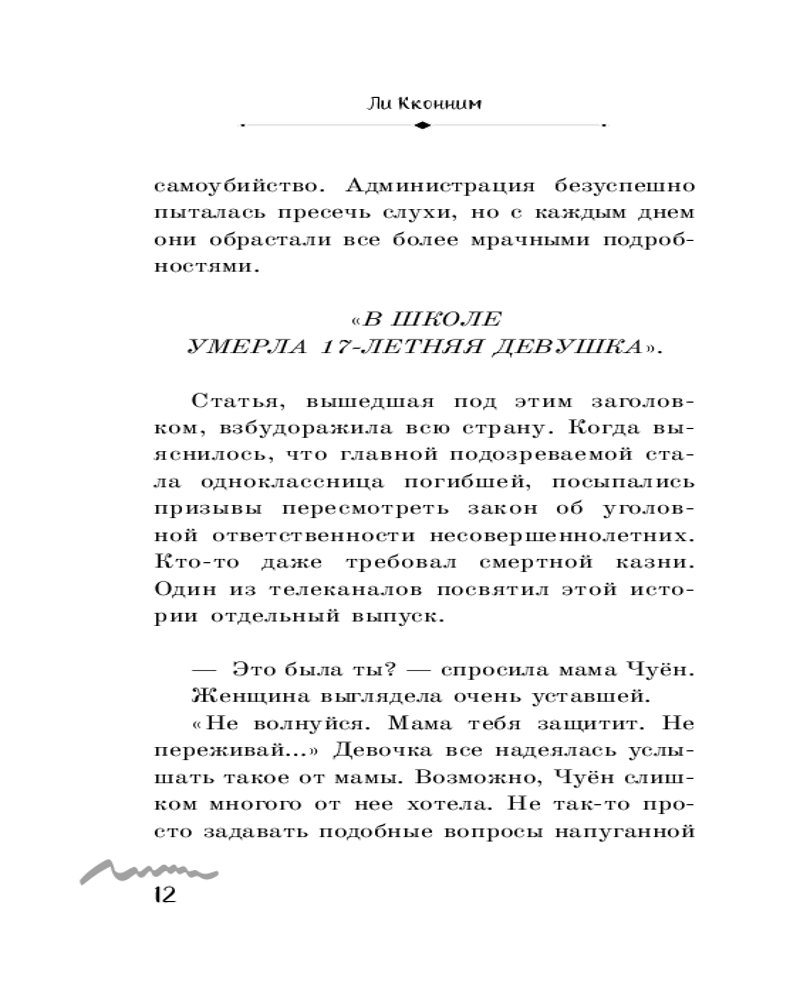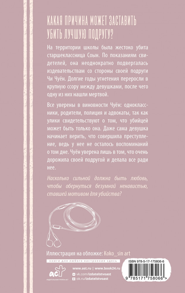 💳 Оплатить за товар можно при получении 🇰🇿 Есть бесплатная доставка по Казахстану от 1 дня 🎁 Копите бонусы с каждой покупки Серия: Хиты Азии. Их история На территории школы была жестоко убита старшеклассница Соын. По показаниям свидетелей, та неоднократно подвергалась издевательствам со стороны своей подруги Чи Чуён. Долгие годы угнетения переросли в крупную ссору между девушками, после чего одну из них нашли мертвой. Все уверены в виновности Чуён: одноклассники, родители, полиция и адвокаты, так как улики свидетельствуют о том, что убийцей может быть только она. Даже сама девушка начинает верить, что совершила преступление, ведь у нее не осталось воспоминаний о том дне. Чуён уверена лишь в том, что очень дорожила своей подругой и делала все ради нее. Насколько сильной должна быть любовь, чтобы обернуться безумной ненавистью, ставшей мотивом для убийства? |