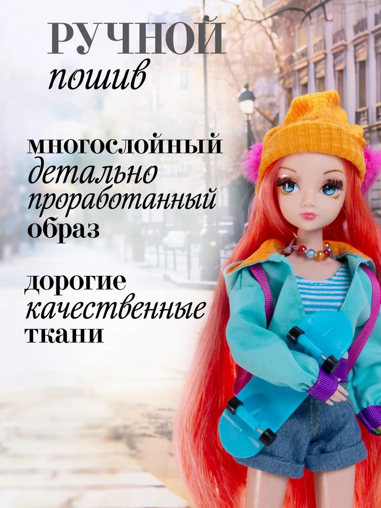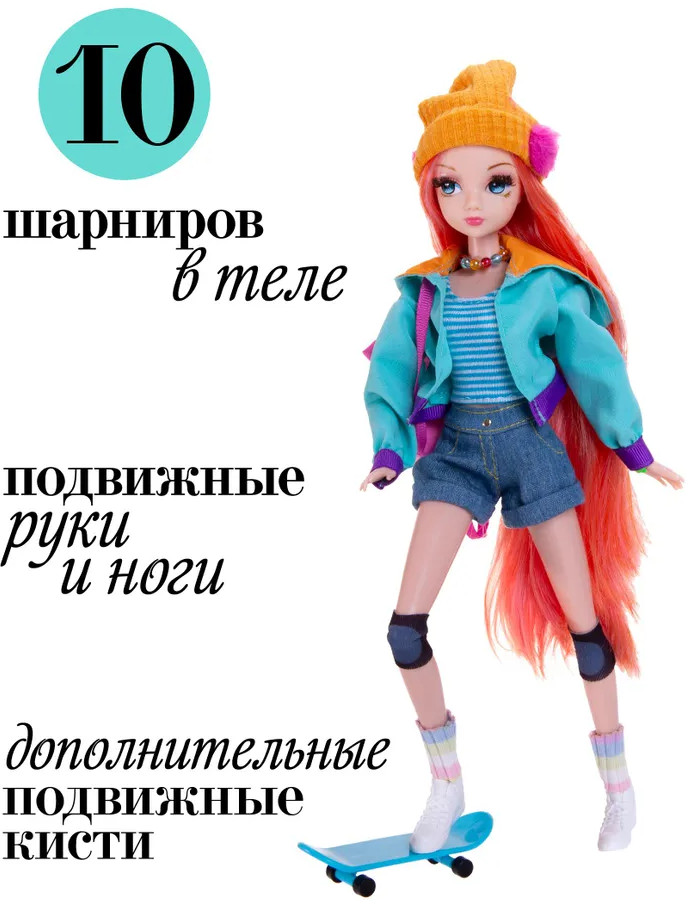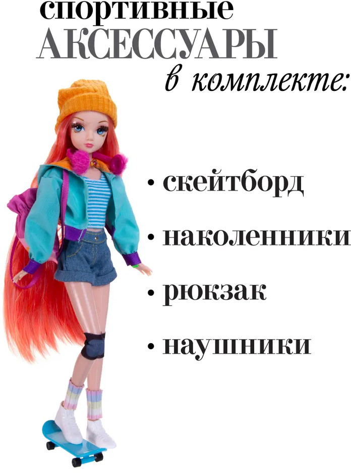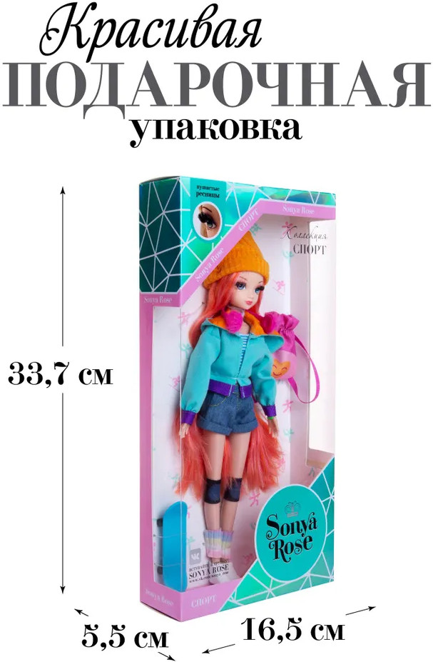 💳 Оплатить за товар можно при получении 🇰🇿 Есть бесплатная доставка по Казахстану от 1 дня 🎁 Копите бонусы с каждой покупки Кукла Sonya Rose из спортивной коллекции предстает перед нами в образе озорной скейтбордистки. Городской образ очень идет куколке и продуман до мелочей. Высота куклы — 29 см. Модная кукла одета в стильную толстовку, шортики и топ, а также гетры и шапочку. На голове у куклы — наушники, а на плечах — яркий рюкзак. Яркие бусы завершают образ кокетки. Непременные спортивные атрибуты также входят в комплект — скейтборд, наколенники и удобные кеды для занятий спортом. Шарнирное тело позволяет кукле принимать различные позы и усиливает элемент спортивной игры. Шелковистые ресницы придают взгляду выразительность, а шикарные рыжие волосы можно расчесывать и укладывать в разные прически. |