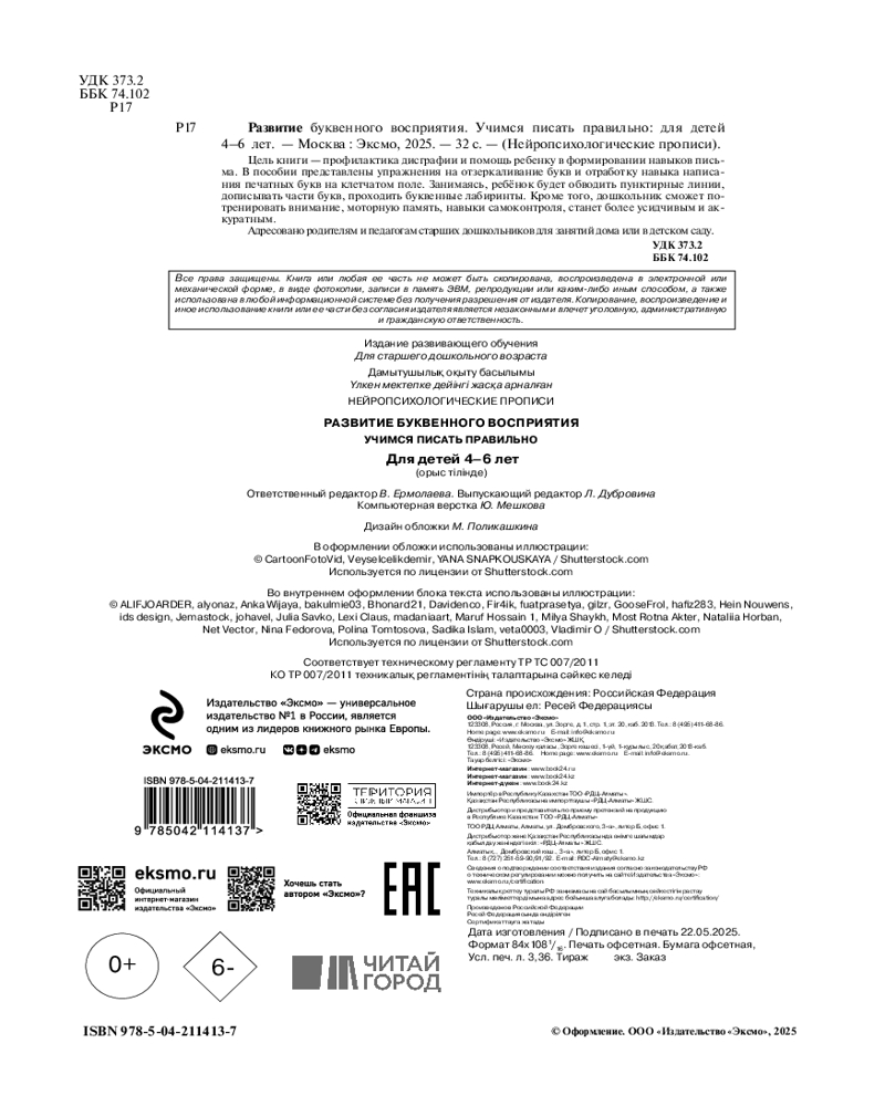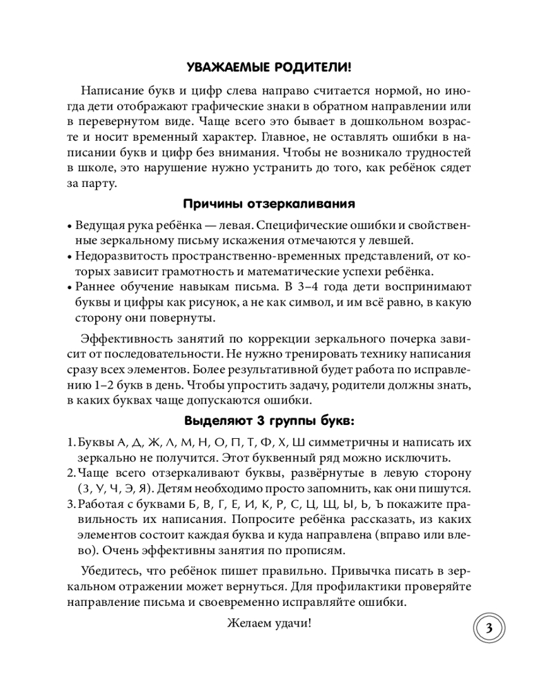 💳 Оплатить за товар можно при получении 🇰🇿 Есть бесплатная доставка по Казахстану от 1 дня 🎁 Копите бонусы с каждой покупки Серия: Нейропсихологические прописи Пособие станет отличным помощником в профилактике дисграфии и навыков письма у старших дошкольников. Задания, представленные в книге, доступны и разнообразны, что позволит ребенку менять виды деятельности и не уставать. Эффективность занятий по коррекции зеркального почерка зависит от последовательности. Не нужно отрабатывать технику написания сразу всех элементов. Более результативной будет работа по исправлению 1–2 буквы в день. Выполняя разноплановые игровые упражнения, ребенок сможет, как настоящий волшебник, превращать палочки в буквы и обводить по пунктирным линиям печатные буквы двумя руками одновременно; научится различать правильные буквы и их зеркальное отражение; потренируется писать печатные буквы на клетчатом поле; будет дорисовывать части букв, проходить буквенные лабиринты. |