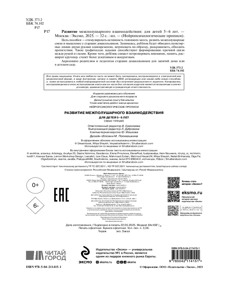💳 Оплатить за товар можно при получении 🇰🇿 Есть бесплатная доставка по Казахстану от 1 дня 🎁 Копите бонусы с каждой покупки Серия: Нейропсихологические прописи Нейропрописи включают в себя графические задания, стимулирующие активность головного мозга, способствующие развитию межполушарных связей и мелкой моторики у старших дошкольников. Любые задержки в этом направлении могут сказаться на качестве дальнейшего обучения. Пособие тематическое. В него включен материал по окружающему миру, соответствующий возрасту ребенка, который будет не только полезным, но и интересным. |