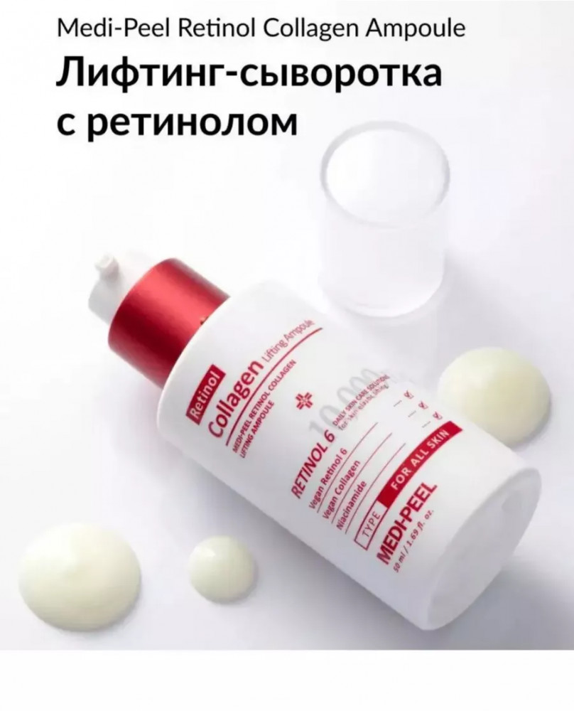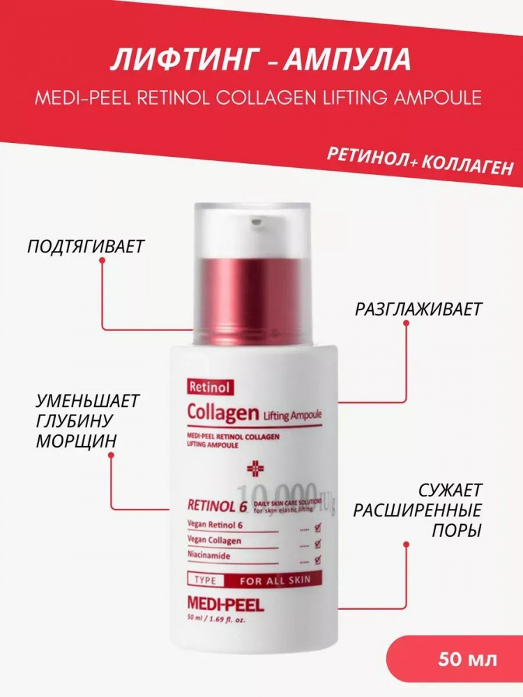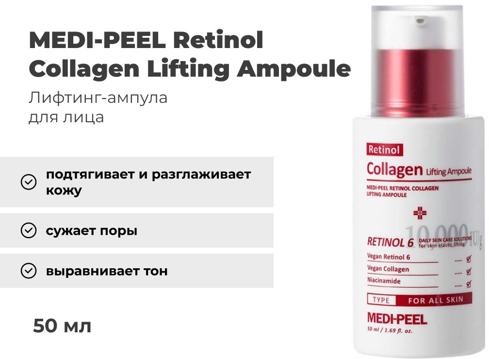 Лифтинг-ампула Medi-Peel Retinol Collagen Lifting Ampoule — это интенсивный концентрат активов с доказанной эффективностью, которые подтягивают и разглаживают кожу, уменьшают глубину морщин, сужают расширенные поры и выравнивают микрорельеф.