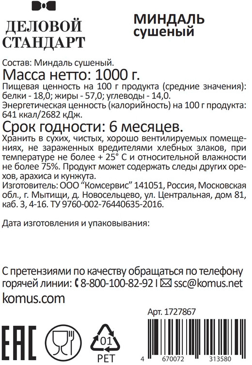 Деловой стандарт Миндаль сушеный