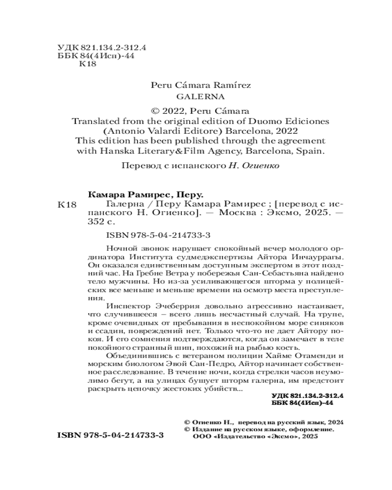 Серия: Tok. Триллеры от мастера жанра. Перу Камара Одна безумная ночь во власти стихии. Один шанс найти убийцу. Ночной звонок нарушает спокойный вечер молодого ординатора Института судмедэкспертизы Айтора Инчауррагы. Он оказался единственным доступным экспертом в этот поздний час. На Гребне Ветра у побережья Сан-Себастьяна найдено тело мужчины. Но из-за усиливающегося шторма у полицейских все меньше и меньше времени на осмотр места преступления. Инспектор Эчеберрия довольно агрессивно настаивает, что случившееся — всего лишь несчастный случай. На трупе, кроме очевидных от пребывания в неспокойном море синяков и ссадин, повреждений нет. Только что-то не дает Айтору покоя. И его сомнения подтверждаются, когда он замечает в теле покойного странный шип, похожий на рыбью кость. |