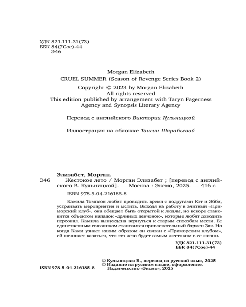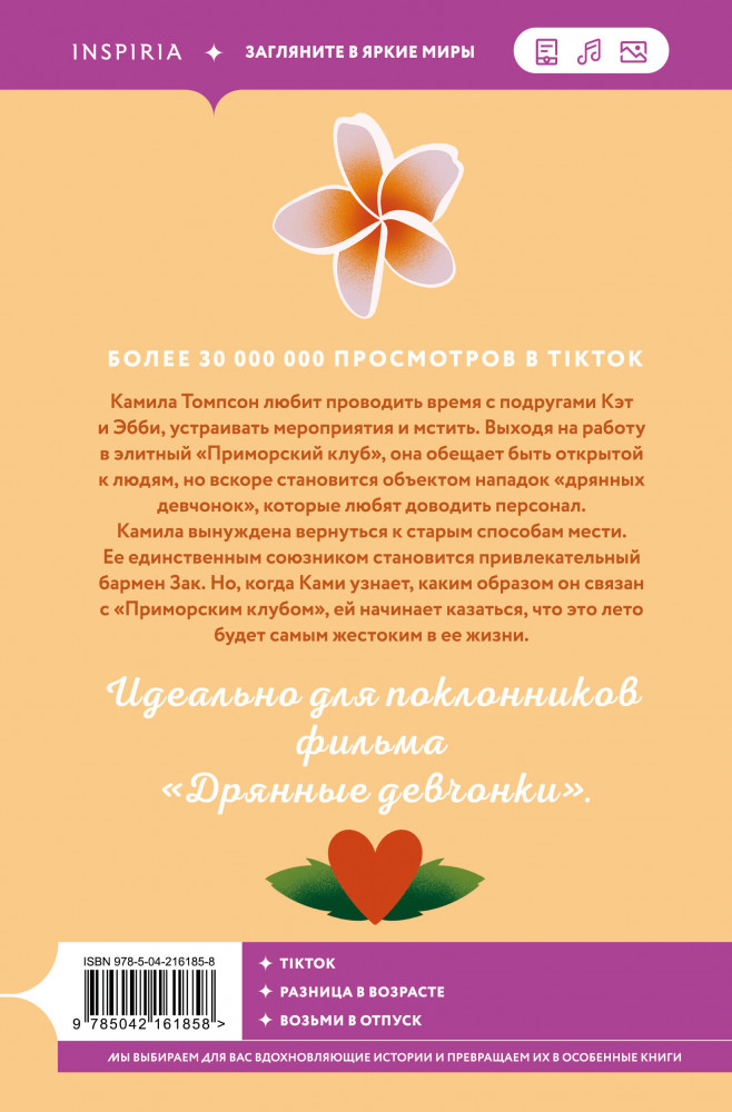💳 Оплатить за товар можно при получении 🇰🇿 Есть бесплатная доставка по Казахстану от 1 дня 🎁 Копите бонусы с каждой покупки Серия: Cupcake. Сезоны мести. Морган Элизабет Камила Томпсон любит проводить время с подругами Кэт и Эбби, устраивать мероприятия и мстить. Выходя на работу в элитный «Приморский клуб», она обещает быть открытой к людям, но вскоре становится объектом нападок «дрянных девчонок», которые любят доводить персонал. Камила вынуждена вернуться к старым способам мести. Ее единственным союзником становится привлекательный бармен Зак. Но узнав, каким образом он связан с «Приморским клубом», Ками начинает казаться, что это лето будет самым жестоким в ее жизни. Идеально для поклонников фильма «Дрянные девчонки». |