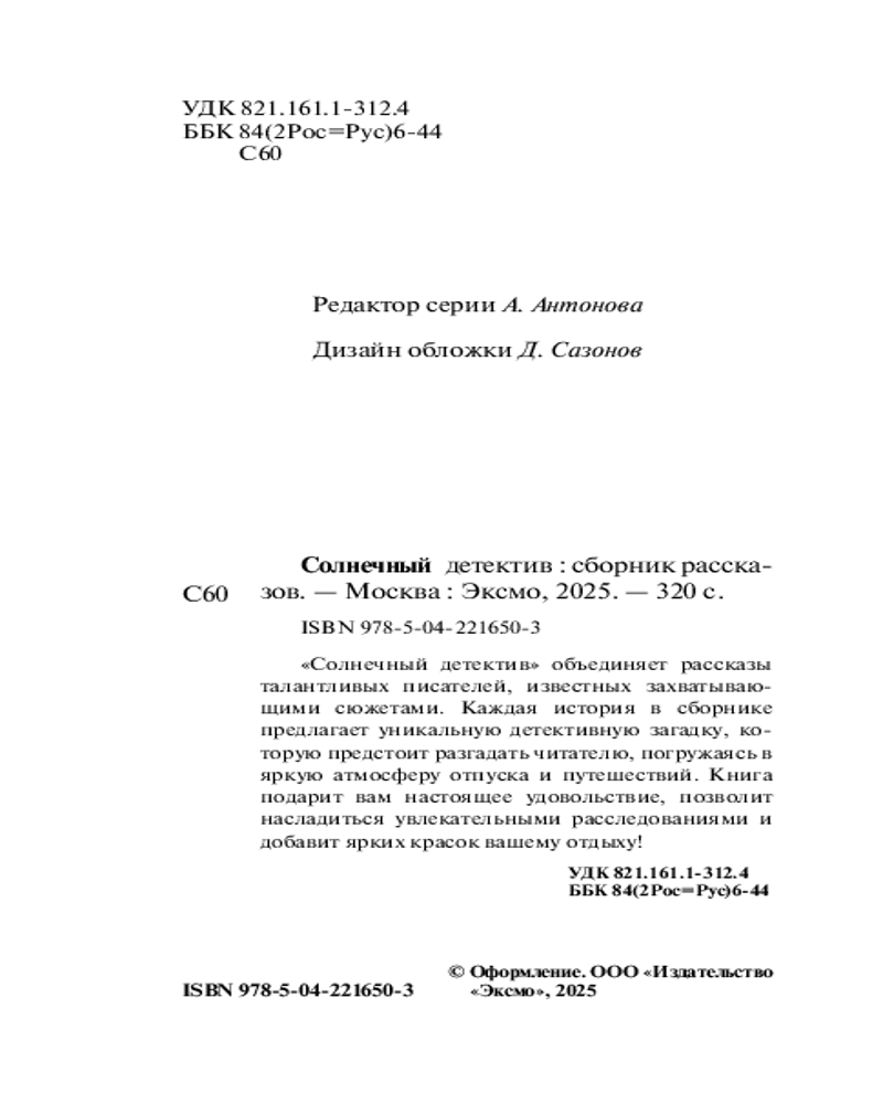 💳 Оплатить за товар можно при получении 🇰🇿 Есть бесплатная доставка по Казахстану от 1 дня 🎁 Копите бонусы с каждой покупки Серия: Великолепные детективные истории. Новое оформление (обложка) «Солнечный детектив» объединяет рассказы талантливых писателей, известных захватывающими сюжетами. Каждая история в сборнике предлагает уникальную детективную загадку, которую предстоит разгадать читателю, погружаясь в яркую атмосферу отпуска и путешествий. Книга подарит вам настоящее удовольствие, позволит насладиться увлекательными расследованиями и добавит ярких красок вашему отдыху! Детективный рассказ требует от автора высшего мастерства, ведь закрутить интригу, расследовать преступление и разоблачить преступника надо всего на нескольких страницах. Этим даром блестяще владеют популярные писатели, чьи рассказы входят в сборник из серии «Великолепные детективные истории». Наслаждайтесь новыми гранями их таланта! |