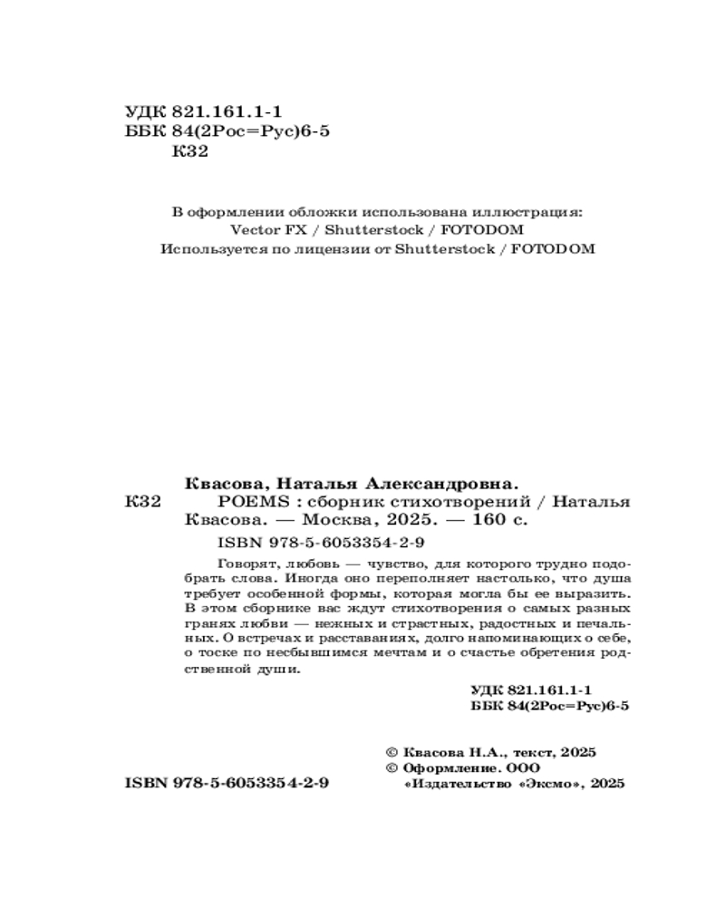 Серия: Наталья Квасова. Цикл романов Первый поэтический сборник Натальи Квасовой — автора романов «Влюбленная в масона» и «Влюбленная в науку» . В нем она продолжает свои размышления о любви и о той невероятной силе, которая у нее есть над людьми. О разлуке, с которой каждому из так или иначе приходится столкнуться в этой жизни. О взаимном притяжении двух людей, с которым трудно бороться, и непонимании, которое может их разделять. О счастье любить и быть любимой, хотя не всегда оно бывает таким уж и простым. |